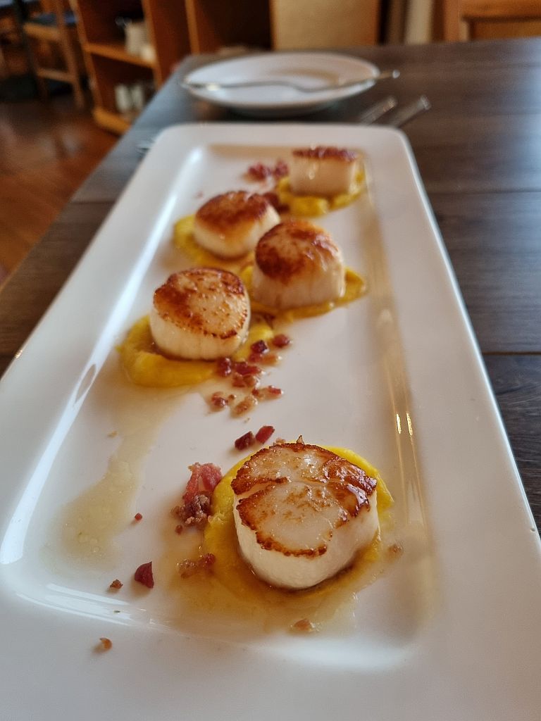 Die in der Pfanne gebratenen Jakobsmuscheln mit Speck und Rübenpüree waren ok, aber leider nichts im Gegensatz zu den anderen Jakobsmuschel-Gerichten, die wir auf dieser Reise genießen konnten.