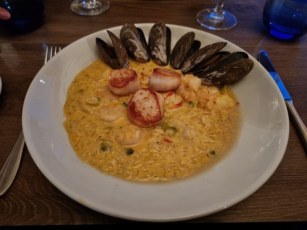 Zeit für die Hauptgänge: Gewinner war ein Teller mit Risotto und verschiedenen Muscheln. Sehr schlonzig und gehaltvoll.