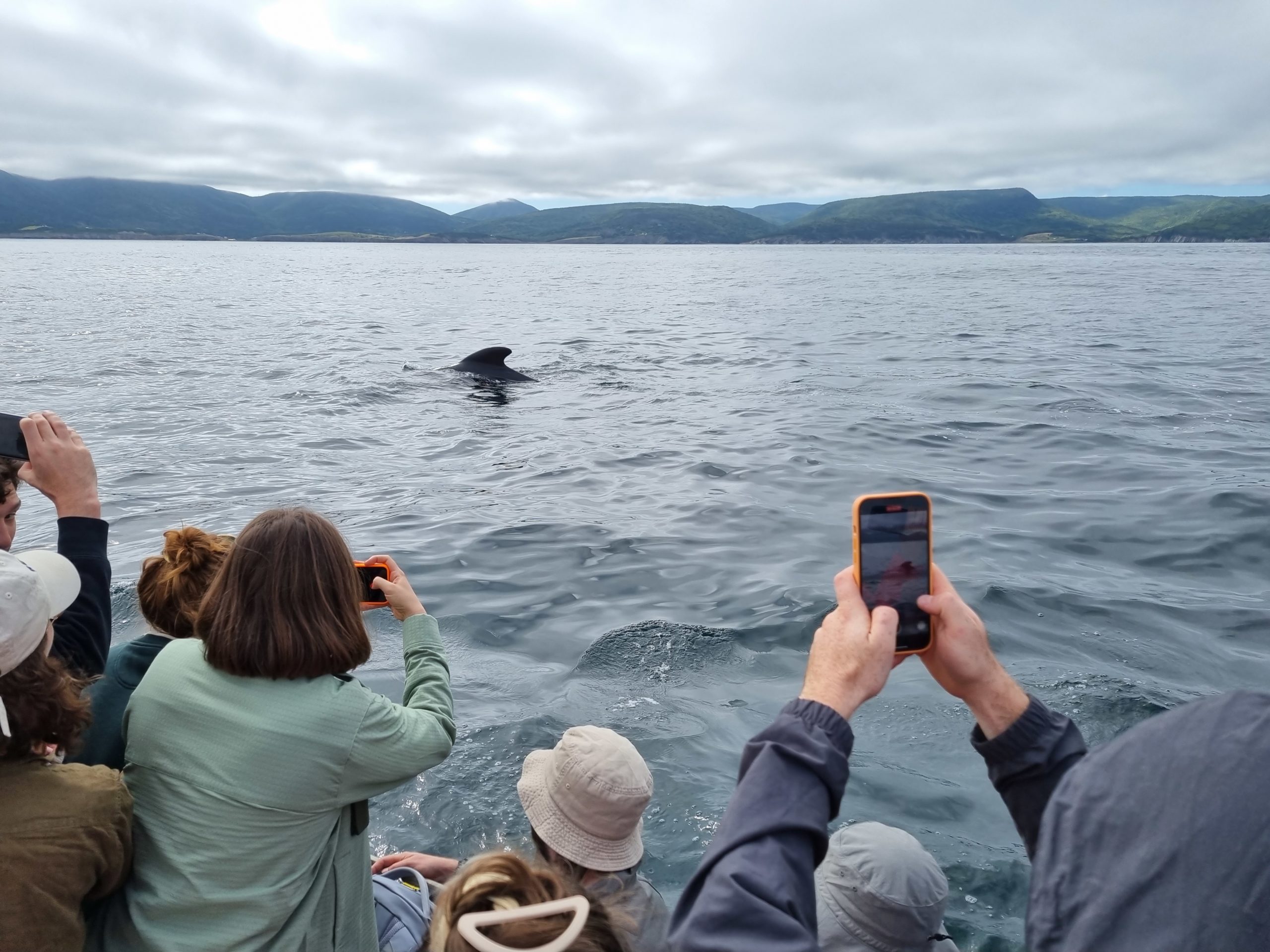 Der Kapitän und die Biologin achteten dabei, dass genug Abstand gehalten wurde bzw. der Motor natürlich immer aus war. Außerdem wurden spannende Details zu den Tieren erzählt, die wir auch noch nicht wussten. Zum Beispiel sind Grindwale im Ernstfall bis zu 40 km/h schnell im Wasser. Außerdem brauchen sie pro Tag etwa 50 Kilo an Essen.