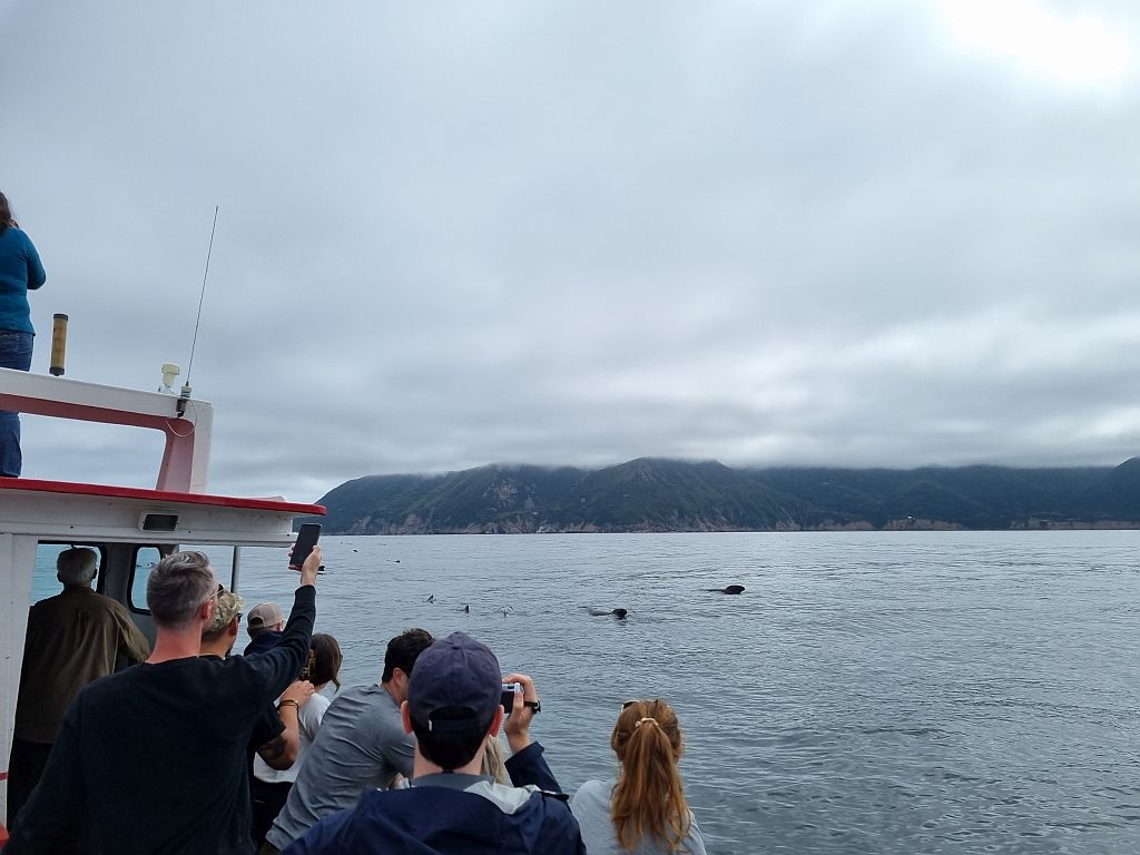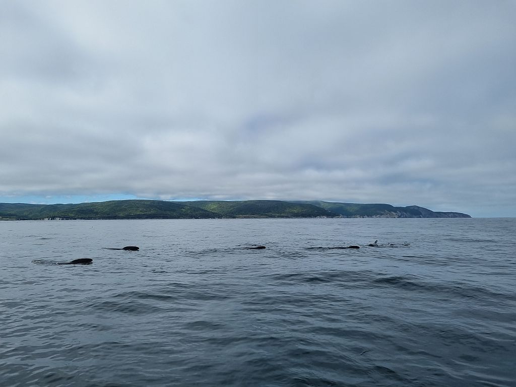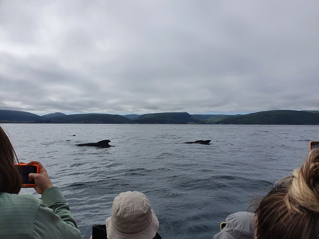 An Bord war eine Meeresbiologin, die entsprechend das Boot dirigierte, sodass wir quasi in den Weg einer Gruppe von Walen standen und die Wale sich entscheiden können, ob sie am Boot vorbei, einen Bogen machen oder drunter wegtauchen wollen. Die beiden Grindwale (auch Pilotwal genannt) fanden das Boot nicht beachtenswert und schwammen direkt an uns vorbei. Und das Gekreische vor allem der Amis interessierte sie auch nicht.