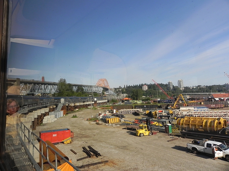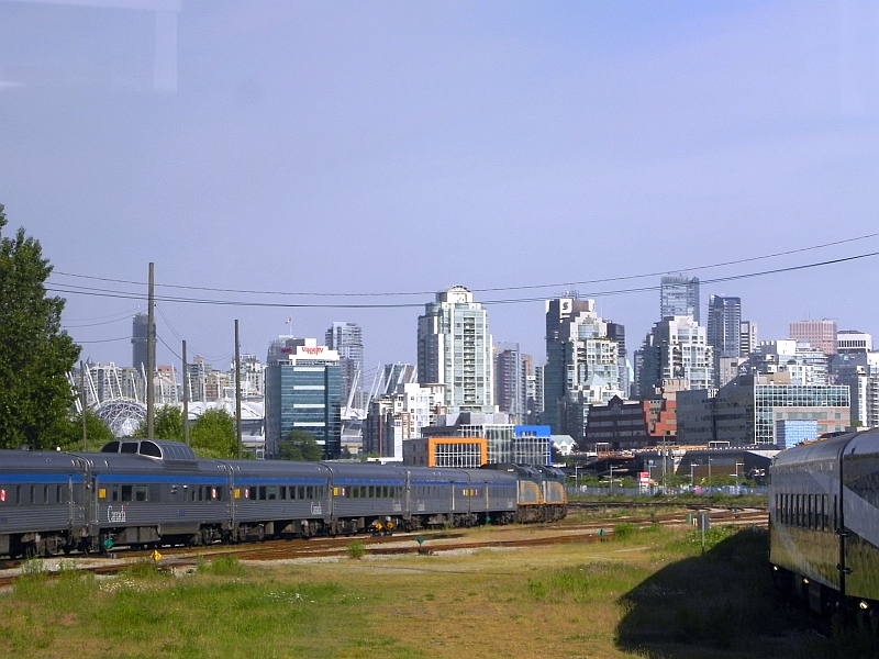 Am nächsten Morgen grüßte uns, neben Sonne und einem fast blauen Himmel, ein Güterbahnhof und der erste Vorort von Vancouver. Dadurch, dass die Züge jetzt die Strecke zwischen Kamloops und Vancouver schneller (weil zweigleisige Strecke) fahren können, hatten wir 35 Minuten Vorsprung vor der eigentlich geplanten Ankunft.