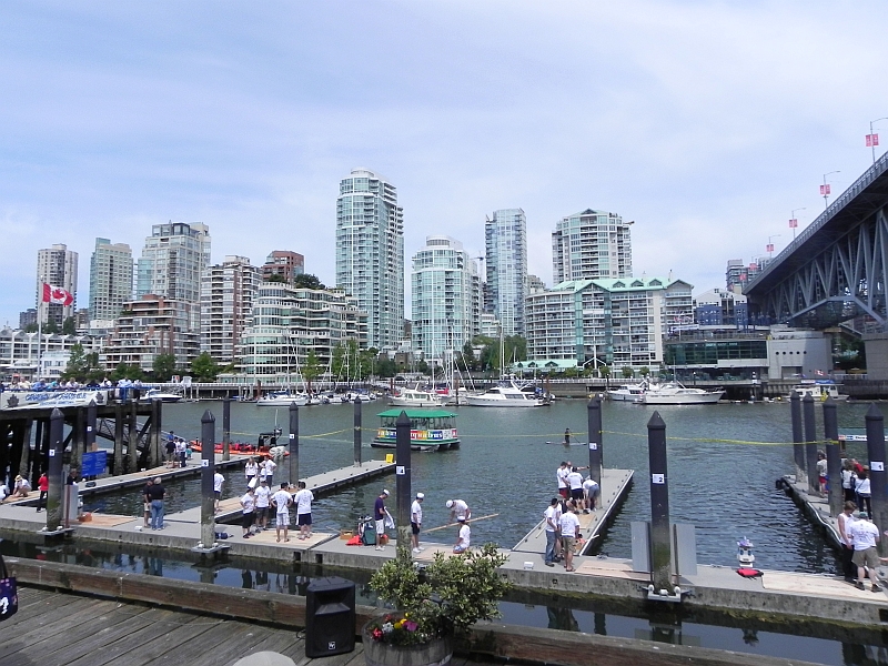 Es handelt sich hier um den sogenannten „Plywood Cup“, einer Veranstaltung für einen gemeinnützigen Zweck. Hier haben sich Teams angemeldet, die in 90 Minuten aus zwei Planken, einem Brett, Nägeln, Klebeband, einer Säge und einem Hammer ein Boot bauen sollen, mit dem dann ein Teammitglied über den False Creek übersetzen muss, an der anderen Seite abklatschen und wieder zum Steg zurückkommen muss.