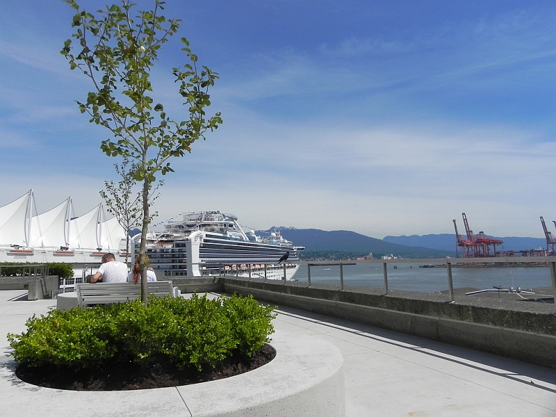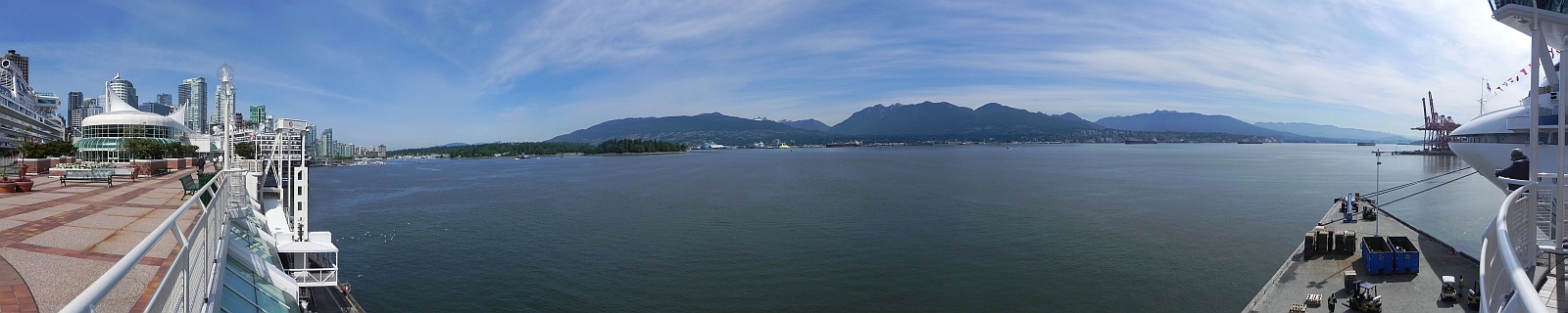 Nachdem wir im Hotel unsere Koffer abgegeben haben, sind wir gleich an den Canada Place gegangen, wo wir einen schönen Blick über den Burrard Inlet, den Hafen, Nord Vancouver und zwei etwas größere Schiffe hatten, die dort angelegt hatten.