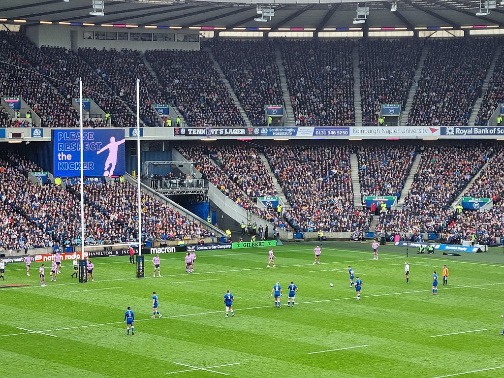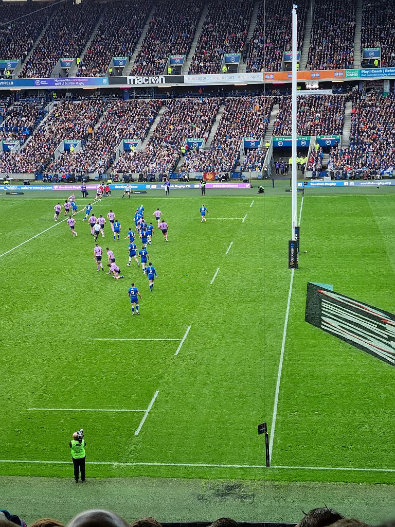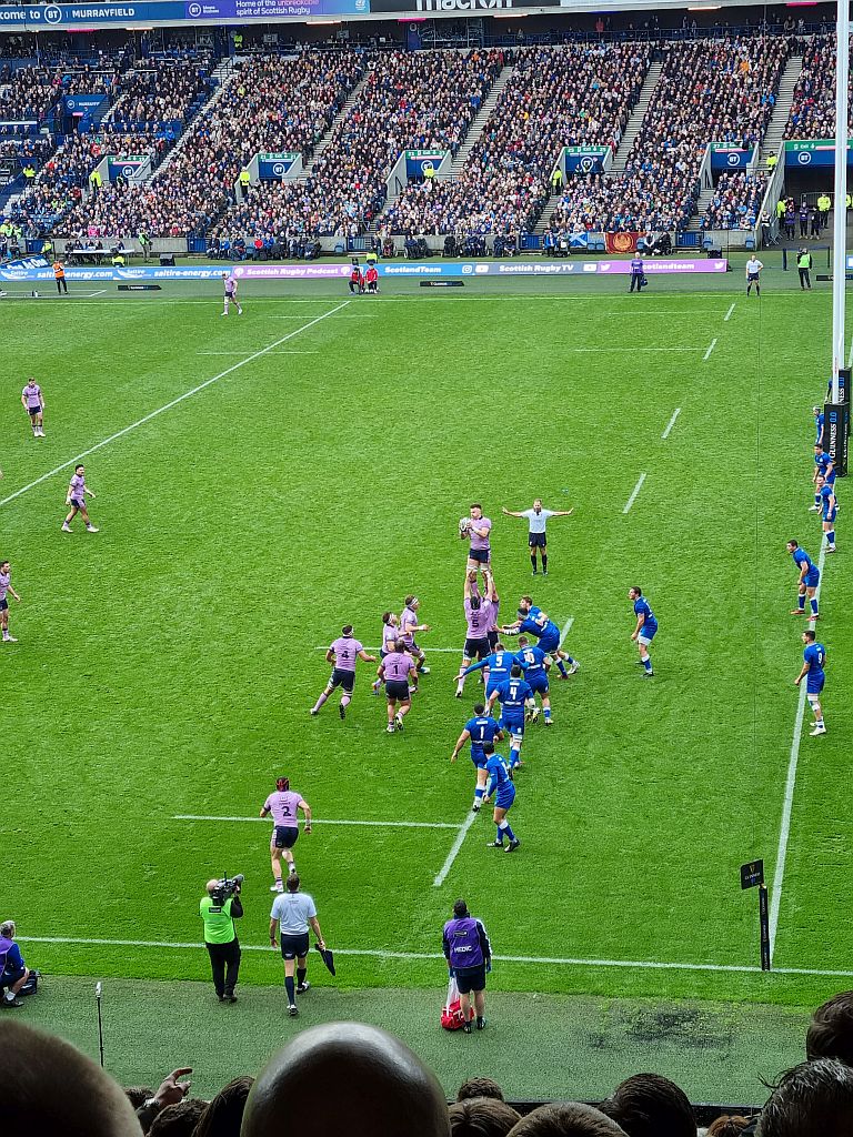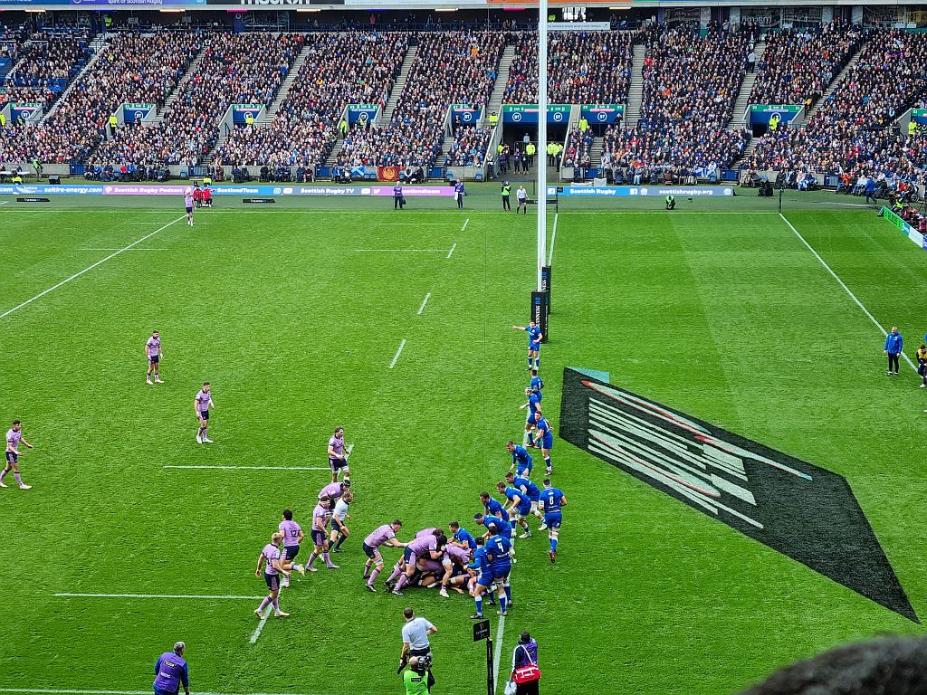 Das Spiel war munter, die Italiener (in Blau) hielten gut mit und es ergaben sich diverse Versuche und schön vorgetragene Angriffe auf beiden Seiten. Allerdings gab es nur 1 Versuche von Italien, dafür aber 4 von Schottland. Aber alle schottischen Versuche wurden von Edinburgh Spielern gelegt: Einer von Durhan van der Merwe und drei von Blair Konghorn, darunter ein sehr schöner lange Lauf am Ende der Partie.