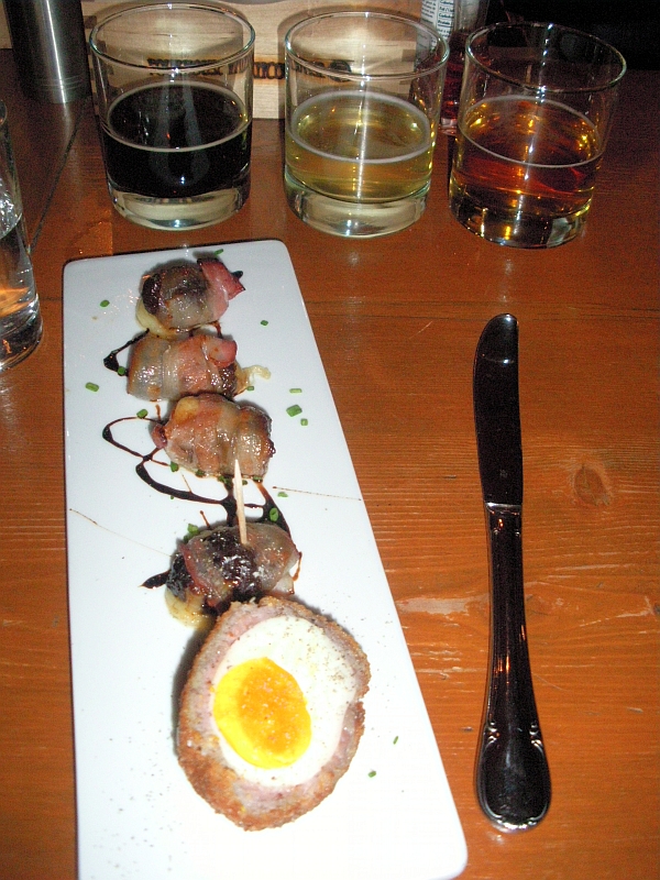 Neben dem Essen (Scotch Egg und Devil on Horseback) gab es hier folgende Biere: Mirror Pond Pale Ale von Deschutes Brewing aus Bend (Ontario), ein White Bark Wheat Ale von der Driftwood Brewing aus Victoria und ein Back Hand of God Organic Stout von Crannog Ales aus Sorrento, BC.