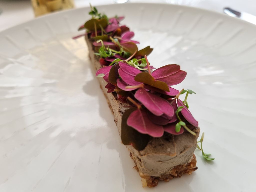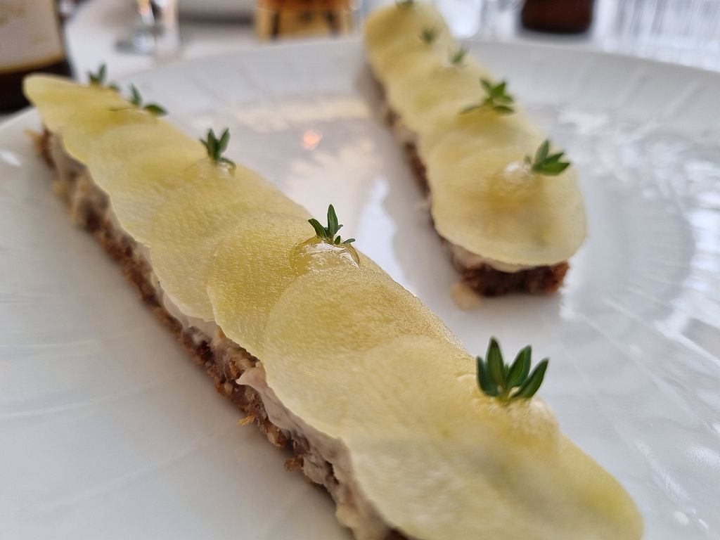 Gut, etwas feiner war es schon, ging aber mehr in die Richtung Leber als gestern der Gruß aus der Küche. Dazu Kräuter und ein sehr fruchtiges Gel als Bindung.