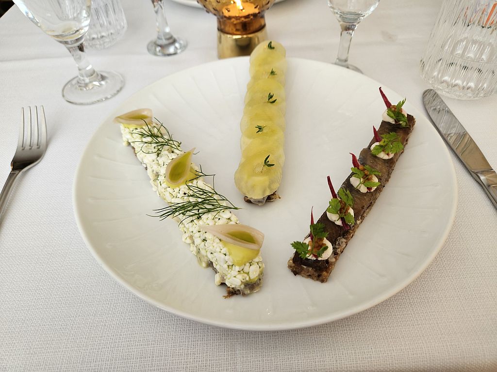 Neben der bekannten von Jens gab es noch eine mit Hüttenkäse, kleinen eingelegten Zwiebeln und Dillöl sowie eine Variante mit dezenter Lakritze und einer sehr intensiven roten, ebenfalls eingelegten Zwiebel.