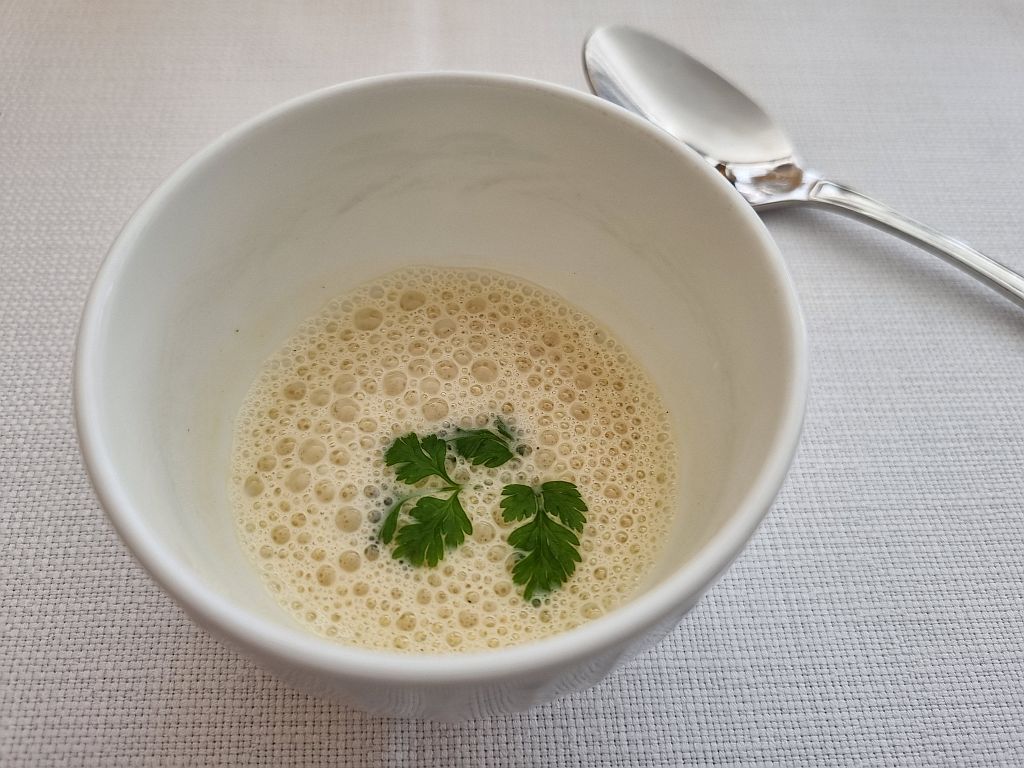 Der sehr freundliche Service platzierte uns in der unteren Etage (wieder Tief-Paterre, genau wie gestern Abend) in einer Ecke und brachte gleich eine wärmende Suppe (die nicht nötig war, aber die Geste zählt). Dazu gab es dann die Speisekarte und ein paar Erklärungen, wie das hier abläuft.