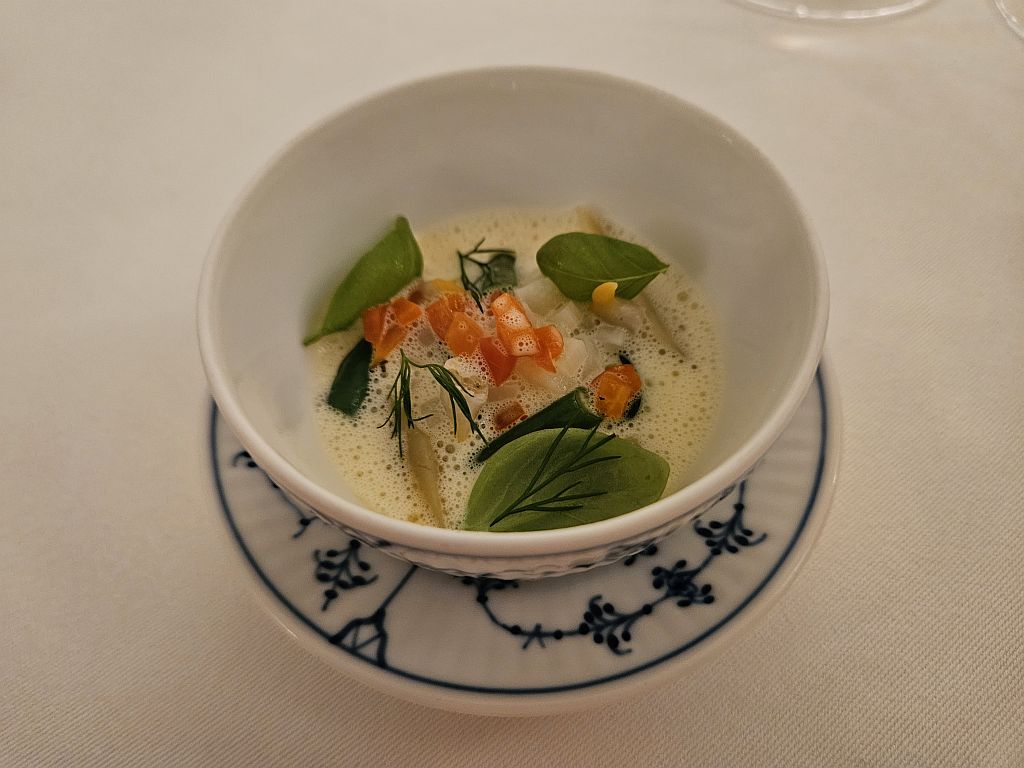 Dann ein etwas modernerer Gang mit hauchdünnen Spargelscheiben, einer Veloute und einer Soja-Limetten-Emulsion.