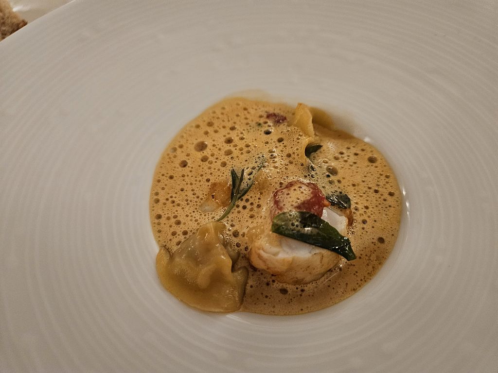 Korrektur des Eindrucks direkt beim nächsten Gang, der direkt aus dem Himmel zu kommen schien: Ein Raviolo mit Langoustinen-Ragout, ein Langoustino, Tomaten und eine Bisque für die wir töten würden.