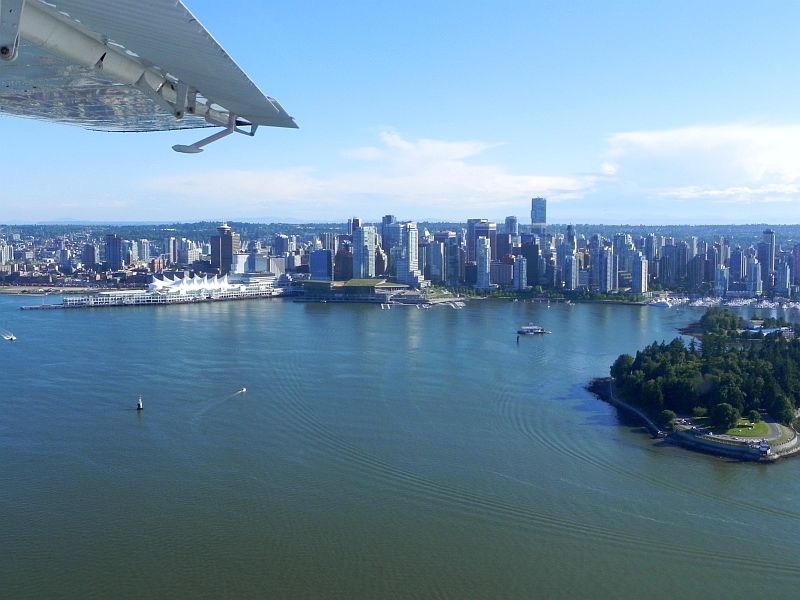 Im Landeanflug entlang der Skyline von Vancouver und dem Stanley Park ging es dann zum Wasserflughafen von Vancouver. Nach einigem Aufprallen auf dem Wasser sind wir dann auch gelandet (man fühlt sich wie so ein Stein, den man auf dem Wasser titschen lässt, wenn ihr wisst, was ich meine) und zum Terminal gefahren.