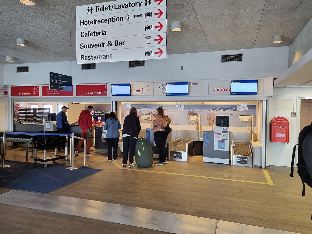 Direkt nach der Landung wird man in den „internationalen Terminal“ geführt. Oder wie man auch sagen kann: In den 2. Raum des Flughafens, denn das das hier mal eine AirBase war, sieht man an allen Ecken und Enden. Für den täglichen Flug nach Kopenhagen musste eine Security-Schleuse eingebaut werden, denn inländische Flüge haben sowas nicht. Um so spannender war es dann, als wir in den eigentlichen Terminal traten: Alles spartanisch und irgendwie kleiner.