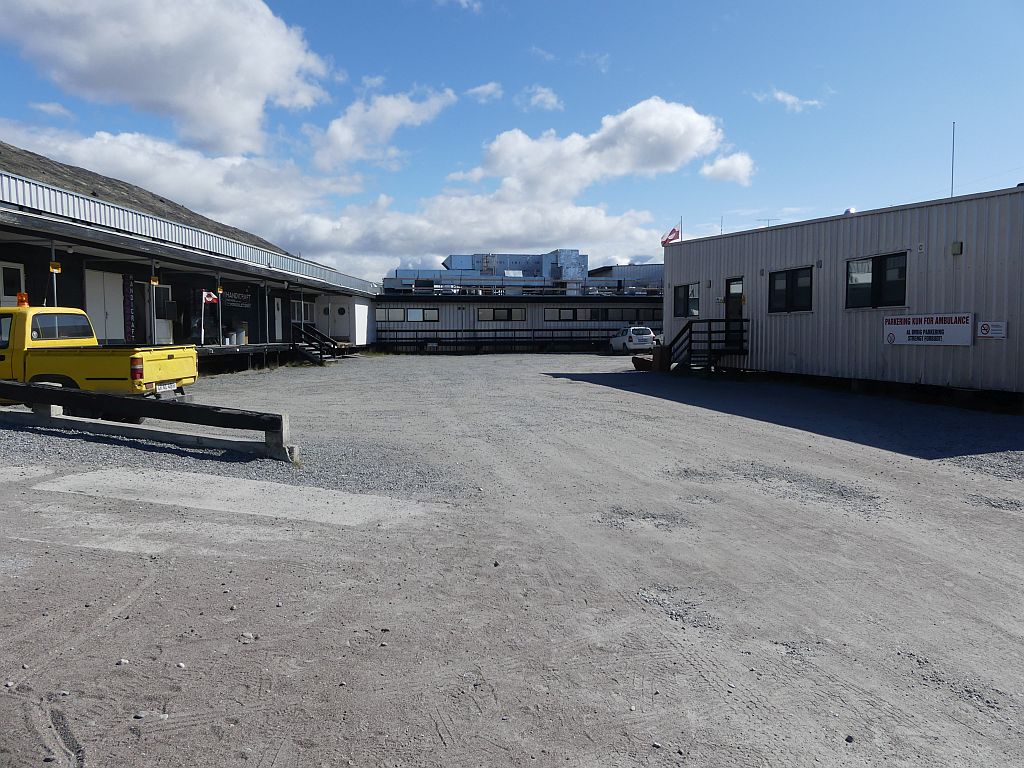 Da wir den Abflug der großen Maschine aus der Nähe miterleben wollten, sind wir dann auch zurück zum Flughafen spaziert. Hier übrigens der völlig überlaufene Vorplatz des internationalen Flughafens von Kangerlussuaq.