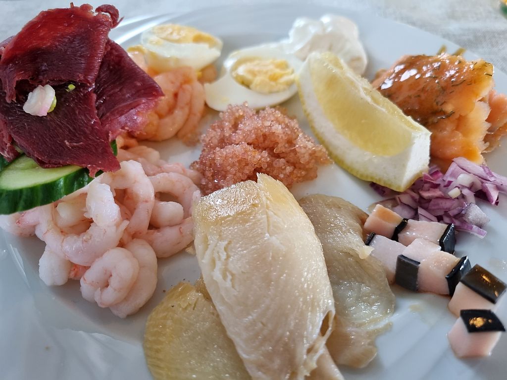 Rentier-Schinken, Brot, Fenchelsalat, Ei und anderes Gemüse rundeten die erste Runde am Buffet ab.
