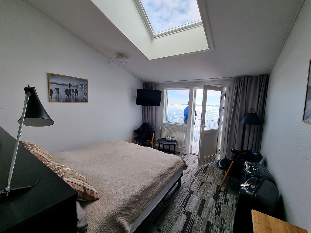 Nachdem ein paar andere Hotels angefahren wurden, waren wir zuletzt im Bus, denn unsere Unterkunft für die nächsten 3 Nächte, das Hotel Icefjord, liegt am anderen Ende des Ortes. Dort wurden wir aber bereits erwartet und erhielten die Schlüssel zu unserem Deluxe-Zimmer. Was im Winter ein Extra-Fenster für die Nordlichter hat.