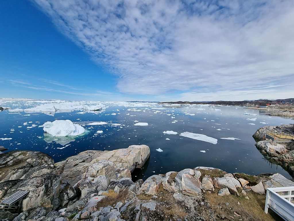 Ilulissat bedeutet in grönländisch übrigens „Eisberge“, was auch den Titel dieses Blog-Artikels erklären sollte. Und die ersten dieser Eisberge, die alle vom Ilulissat-Eisfeld stammen, was von einem der aktivsten Gletscher Grönlands mit Eisbergen befüllt wird, dem Sermeq Kujalleq mit einer Fließgeschwindigkeit von 19 Metern pro Tag!