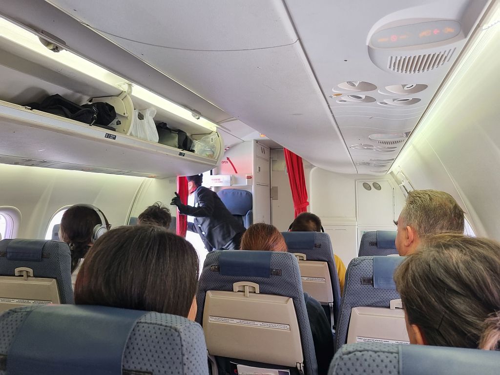 In unserem Fall hatte sich jemand auf unsere Plätze gesetzt. Da wir aber keine Lust auf Diskussion für den 18 Minuten dauernden Flug hatten, setzten wir uns einfach dahinter.