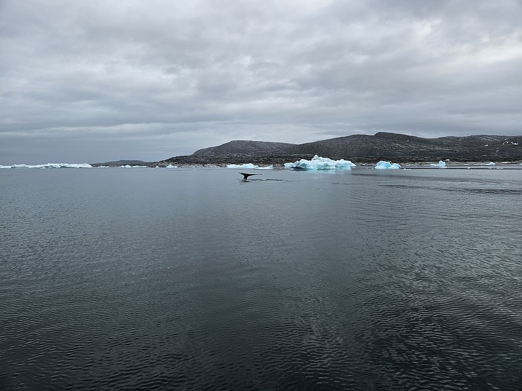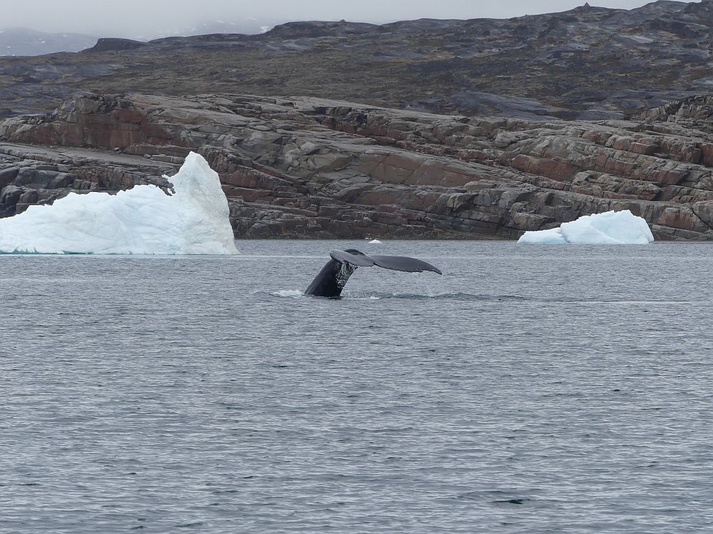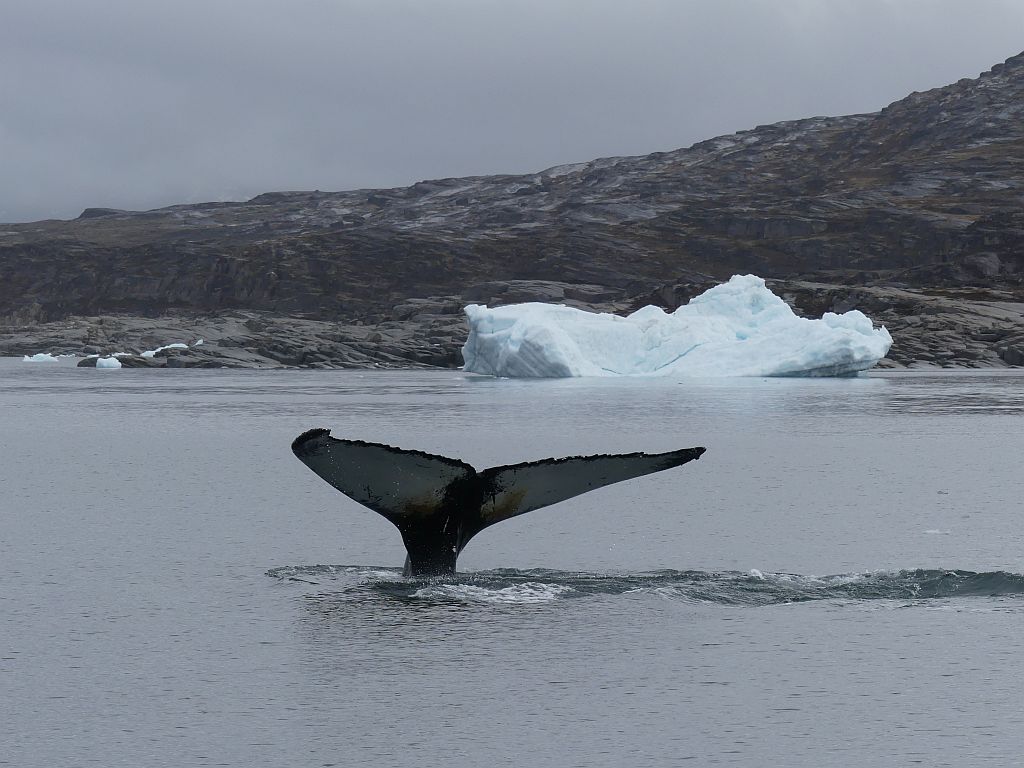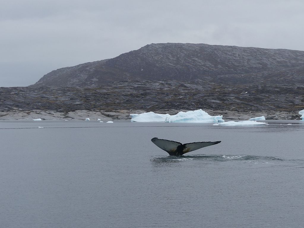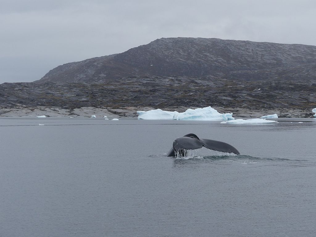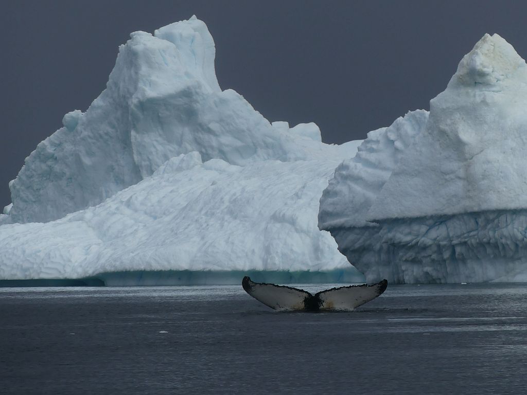 Und ab dann folgten wir dem Buckelwal eine ganze Weile und bekamen inmitten der Eisberge eine echte Wal-Show zu sehen.