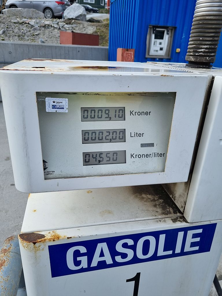Hier gab es auch eine Tanke. Und die Preise sind erstaunlich günstig, weil bereits seit mehreren Jahren stabil. In Grönland ist es so, dass einmal für das ganze Land eingekauft wird (es gibt mehrere Tanklager im Land) und es dann Gesetz ist, dass das Benzin zum Einkaufspreis weiterverkauft werden muss. Das bedeutet: Man zahlt heute noch den Preis, der vor 3 Jahren gezahlt wurde.