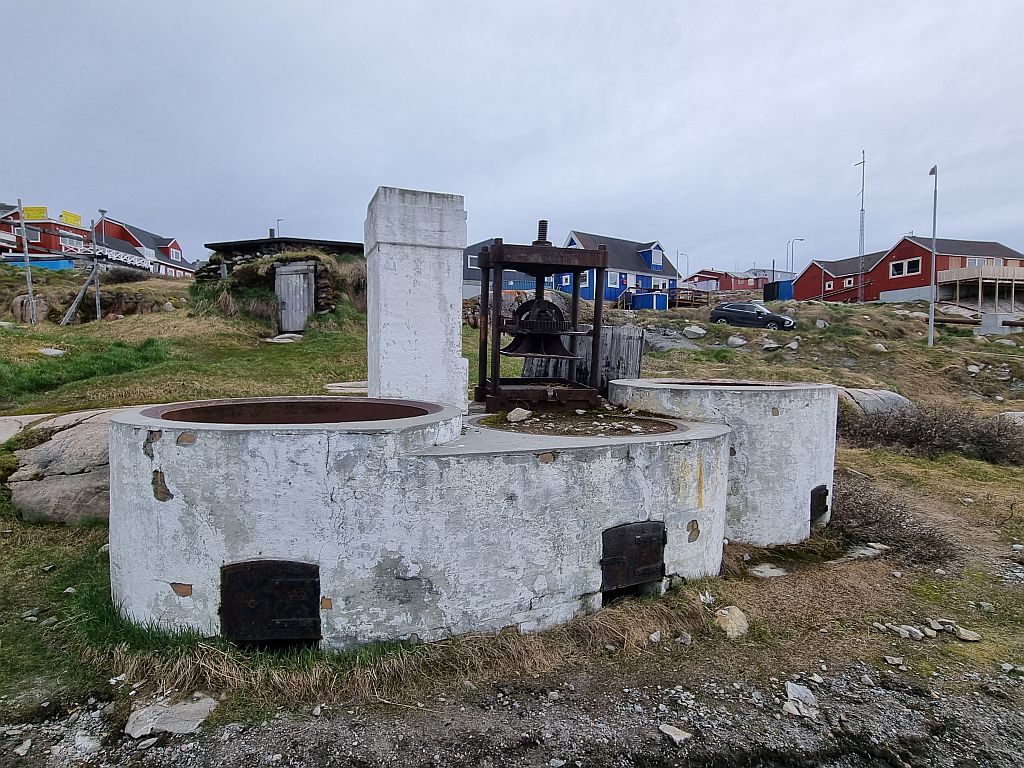 Mit diesen Dingern wurde das Walfett aus den Tieren gepresst, was zu Beginn der Kolonialisierung hier oben der Exportschlager schlechthin war. Das Walfett wurde nämlich überall für die Straßenbeleuchtung eingesetzt und brachte den ersten Reichtum hier oben. Mit allen Konsequenzen, die so etwas eben mit sich bringt.