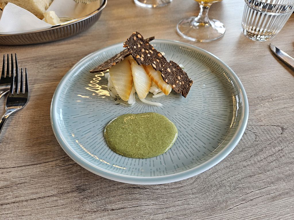 Und das Essen war sehr gut – was ebenfalls für den Service galt. Jakobsmuscheln mit Artischocken-Chips.
