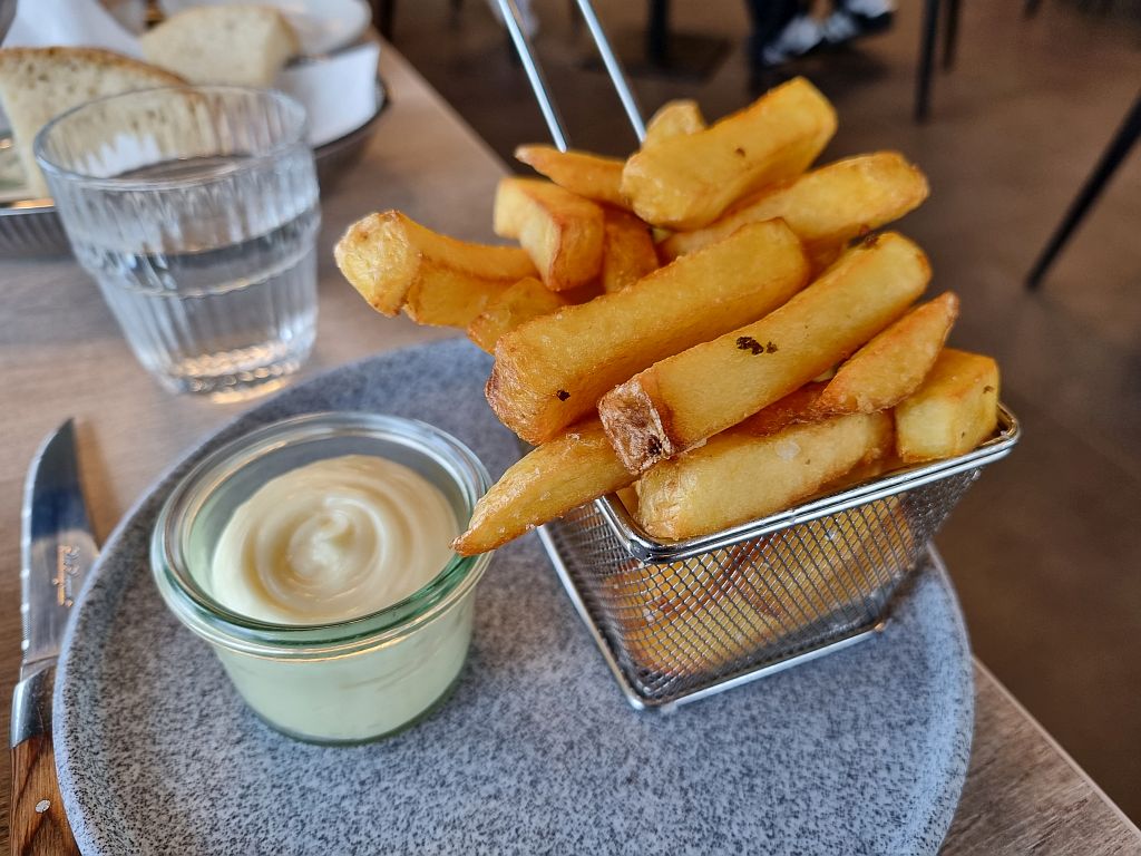 Dazu hervorragende Pommes! Allerdings schon wieder mit Aioli, warum das hier auch immer so beliebt ist …