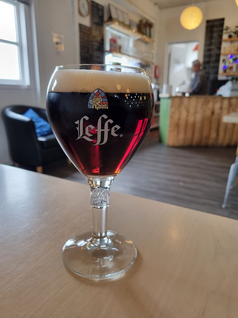 Was dann für uns überraschend war: Leffe Bruin vom Faß! In einem 800 Seelen Ort in Grönland. Im passenden Glas!