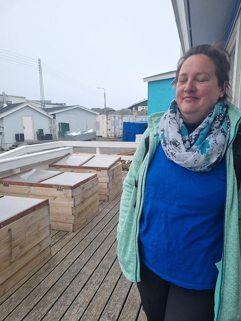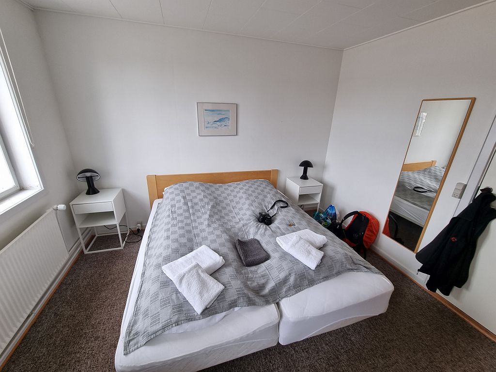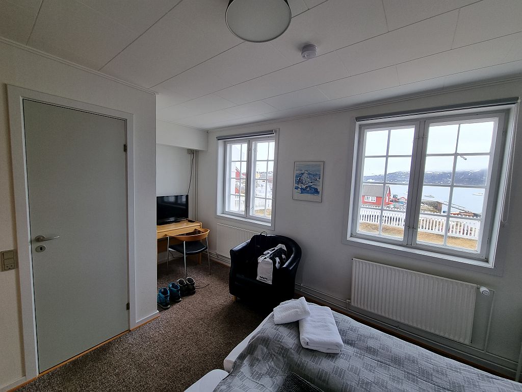 Nach 3 Nächten im Hotel Icefjord in Ilulissat hieß es heute früh: Koffer packen und umziehen. Wie früh? Nun, Meikes Gesicht spricht hier Bände …