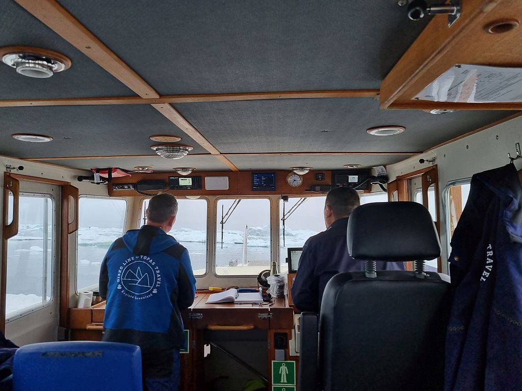 Also: Ab zum Hafen mit leichtem Gepäck, denn die großen Koffer hatten wir im Hotel deponiert und nur unsere Rucksäcke sowie eine „Danpa“-Tasche mitgenommen. Am Hafen dann ging es quasi als ob man in einen Bus einsteigen würde auf eine Fähre und nachdem alle geplanten Gäste (4 weitere Personen waren das) an Bord waren, ging es auch los quer durch die Eisberge.
