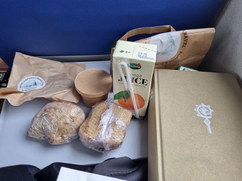 Frühstück gab es im Hotel Icefjord erst ab 7 Uhr und da unsere Fähre früher ging, haben wir ein völlig ausreichendes Frühstückspaket eingepackt bekommen.