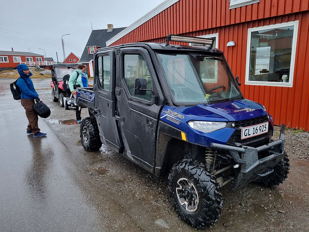 Der grönländische Name ist Qeqertarsuaq und konsequenterweise heißt die Stadt auf der Insel Qeqertarsuaq Town. Und in dessen Hafen landeten wir dann an und wurden gleich in Empfang genommen. Unsere Koffer wurden auf dieses … Ding geladen und die 600 Meter zum Hotel gefahren. Nicht, dass wir das nötig gehabt hätten, aber im Regen war das schon angenehmer.