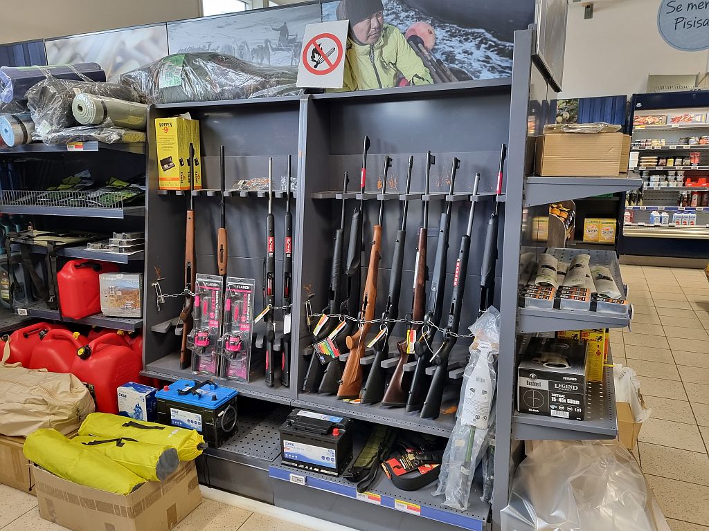 Ja, auch Waffen. Das Dorf lebt eben von der Jagd, man ist aber von amerikanischen Verhältnissen weit entfernt. Außerdem bekommt man nur mit einer Jagdlizenz und einer Art „Waffenführerschein“ ein Gewehr oder auch Munition.