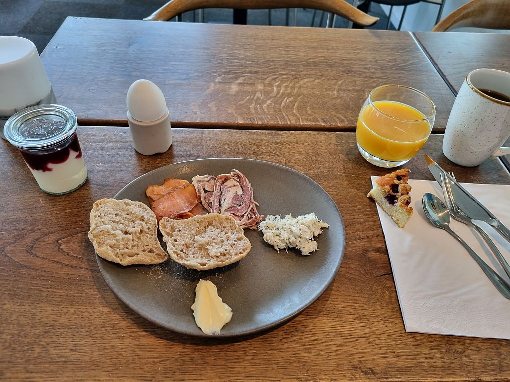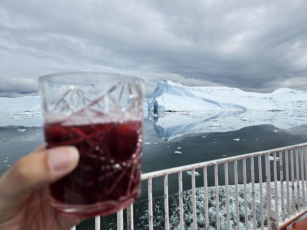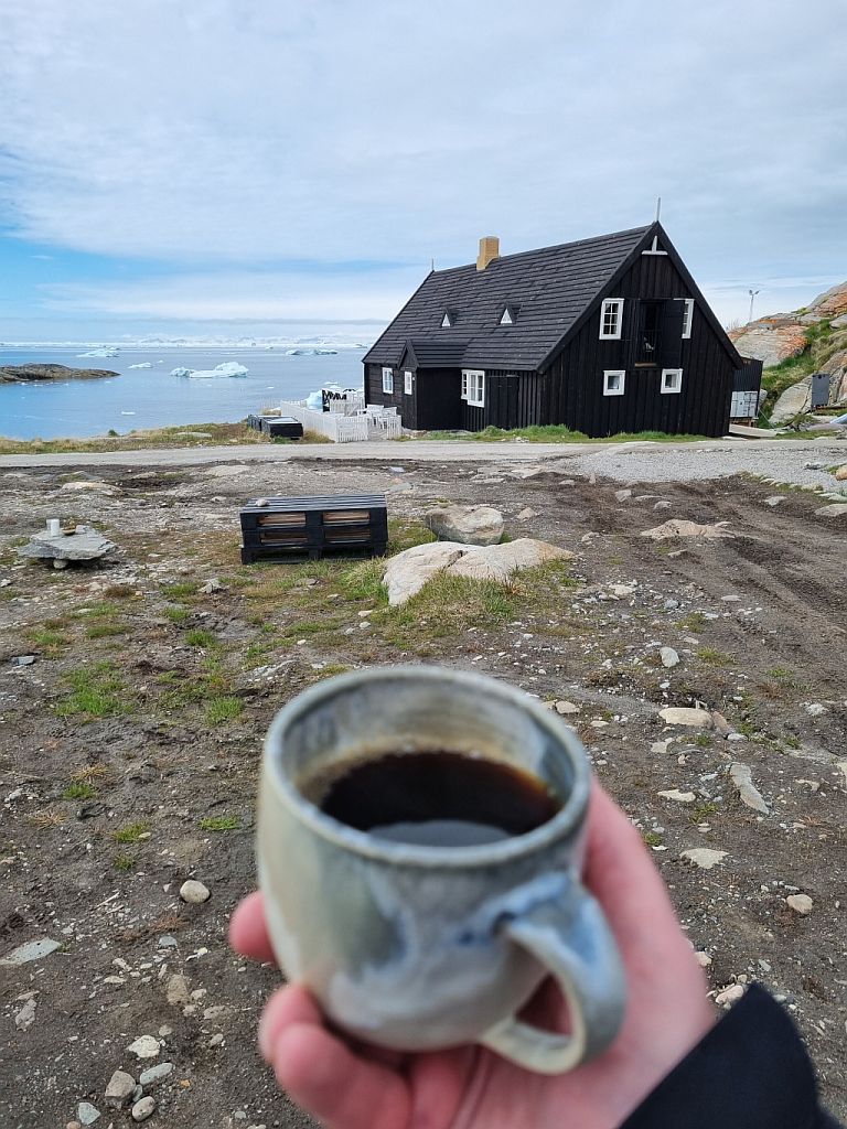 Dazu aber später mehr, denn erst einmal sollten wir noch einmal mit Sicht auf die Eisberge gemütlich in Ilulissat frühstücken. Dieses Mal sogar mit zerhacktem Heilbutt und einem leckeren Küchlein.
