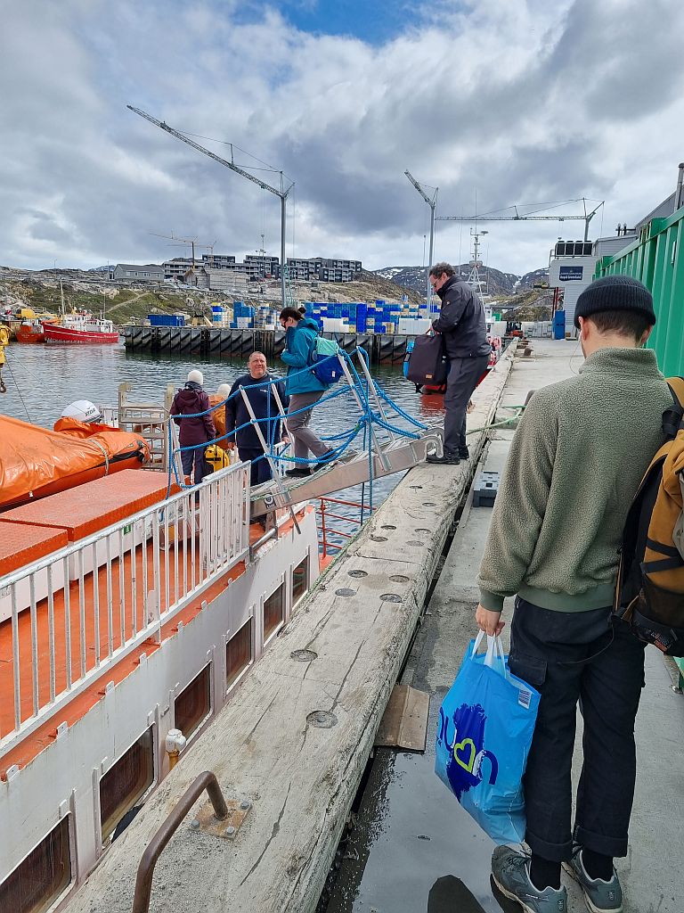 Warum nur einen Koffer? Weil wir im Gegensatz zur Disko Insel mehr Sachen, aber nicht alle mit hatten. Denn selbige hätten wir diese kleine Gangway und, noch schlimmer, eine steile Treppe hinab schleppen müssen.