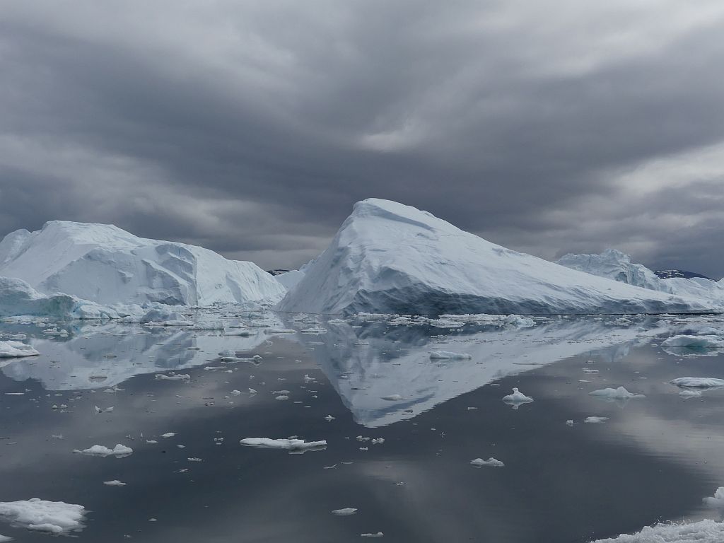 Das Schiff nahm quasi eine kleine Sightseeing-Route durch den Ilulissat Glacier (auf grönländisch Sermeq Kujalleq genannt) und gerade mit dem dunkel bewölktem Himmel und dem sehr ruhigen Wasser ergab das fantastische Blicke, denen Fotos nicht wirklich gerecht werden.