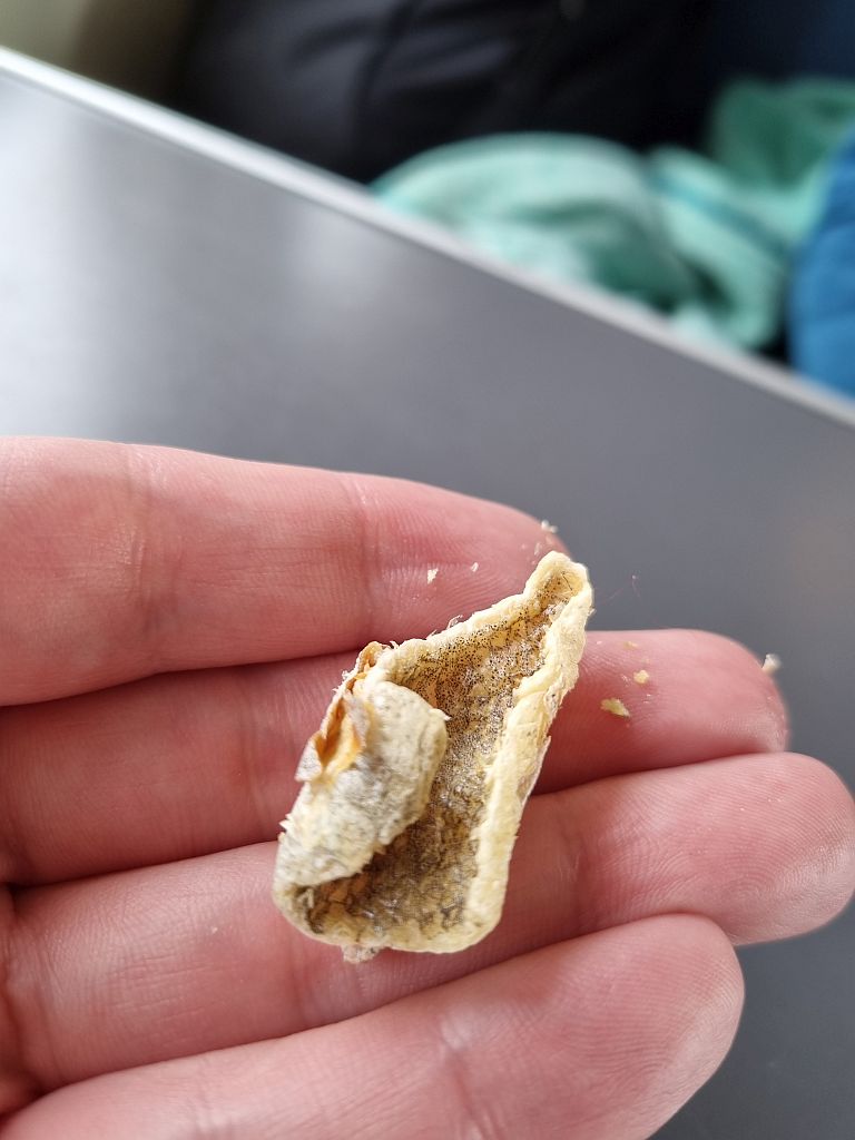 Dazu gab es noch frittierte Haut vom Kabeljau, sehr natürlich gehalten mit ein bisschen Salz.
