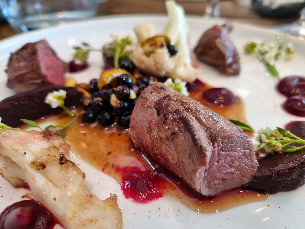 Beim Hauptgang, Rentier mit roter Beere und Blumenkohl, dann die nächste Enttäuschung: Bei den Fleischstücken waren zwei dabei, die absolut nicht essbar waren, weil knorpelig und mit Sehnen durchsetzt.