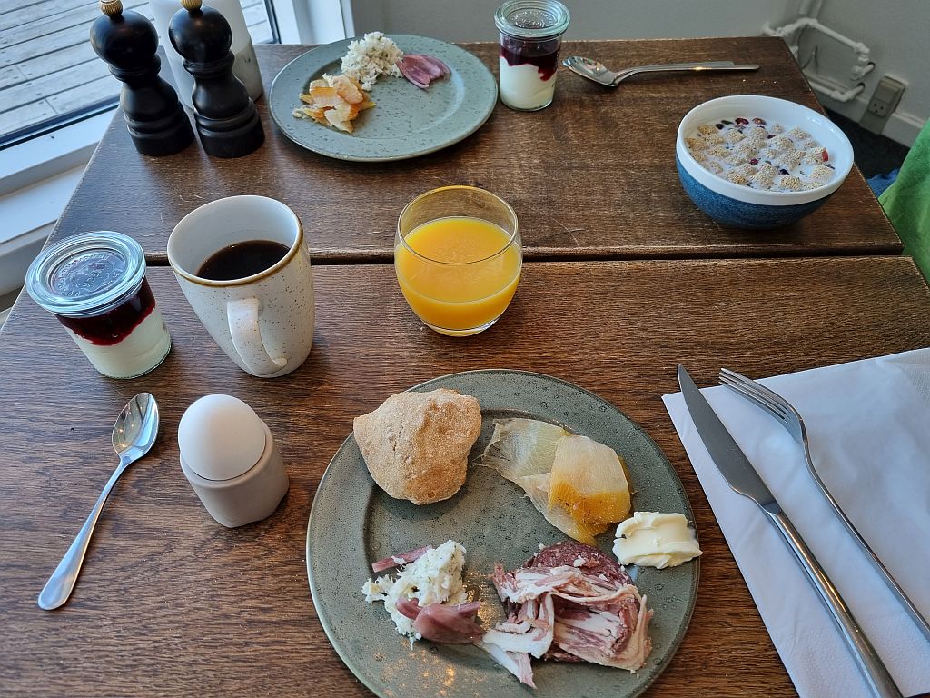 Aber ein paar Stunden Schlaf gelangen uns dann doch schon, bevor wir so spät wie möglich beim Frühstück aufschlugen und ein letztes Mal mit Blick auf den Fjord aßen.