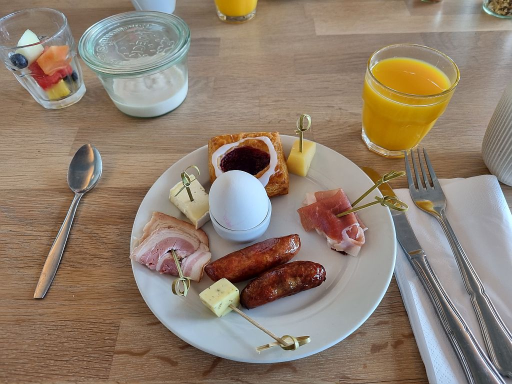Vorher haben wir aber, trotz dem etwas alkoholhaltigen Abend gestern, unseren Wecker diesmal nicht überhört, sondern sind brav aufgestanden und haben das durchaus schöne Wetter entdeckt. Und daraufhin geduscht, gepackt und sind runter zum Frühstück.