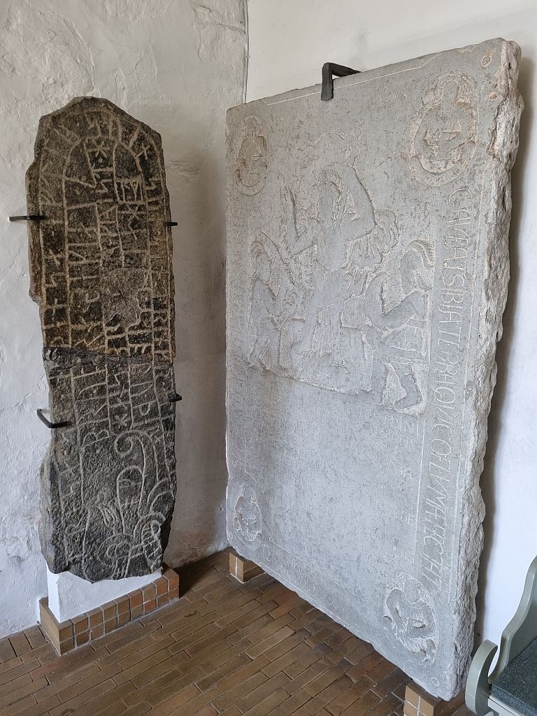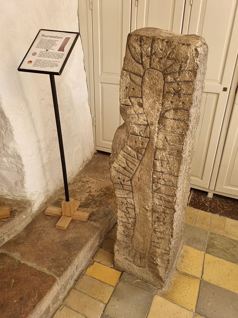 Am Eingang: Runensteine. Und wir wissen immer noch nicht, warum die Verbindung Runensteine und Rundkirche besteht.