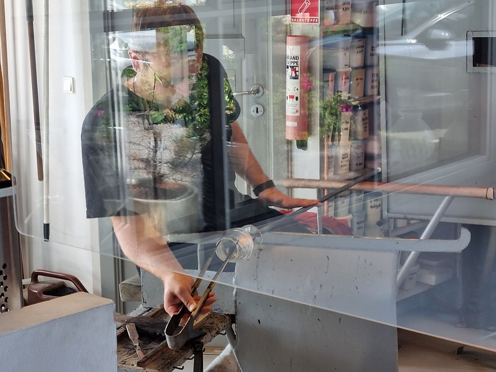 Sehr cool, wie mit einer überdimensionierten Anrichte-Zange das kurz erwärmte Glas geöffnet und mundgerecht geformt wurde.