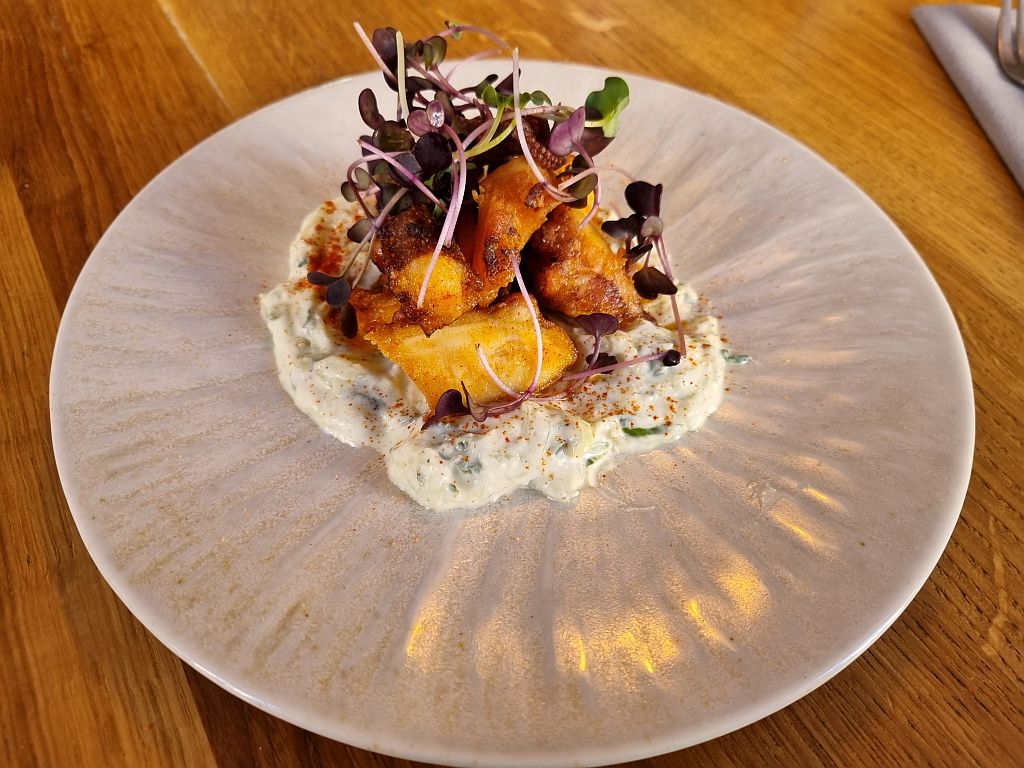 Die Alternativen hatten es daher bei uns schwer zu punkten, aber sie taten es. Denn das war auch sehr gut, wenn auch nicht gerade günstig für ein Brauerei-Restaurant. Als erstes gab es für Jens gebratenen Pulpo – herausragend lecker!