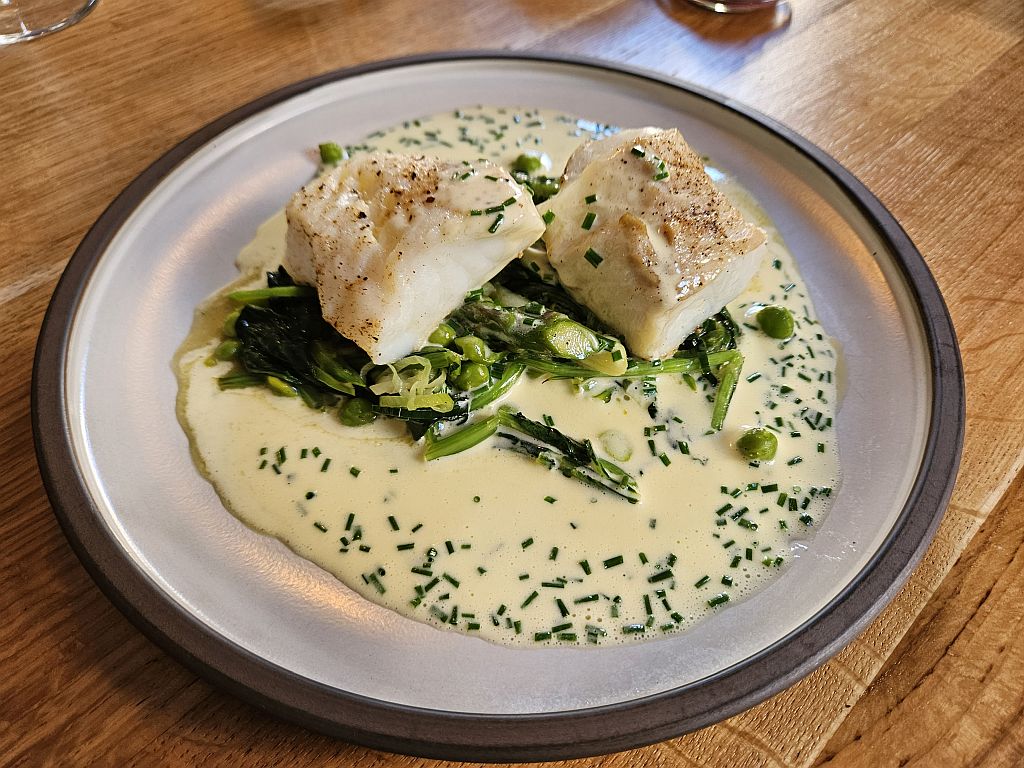 Hauptgang war Kabeljau mit grünem Gemüse und einer Schnittlauch-Creme-Sauce für Meike …
