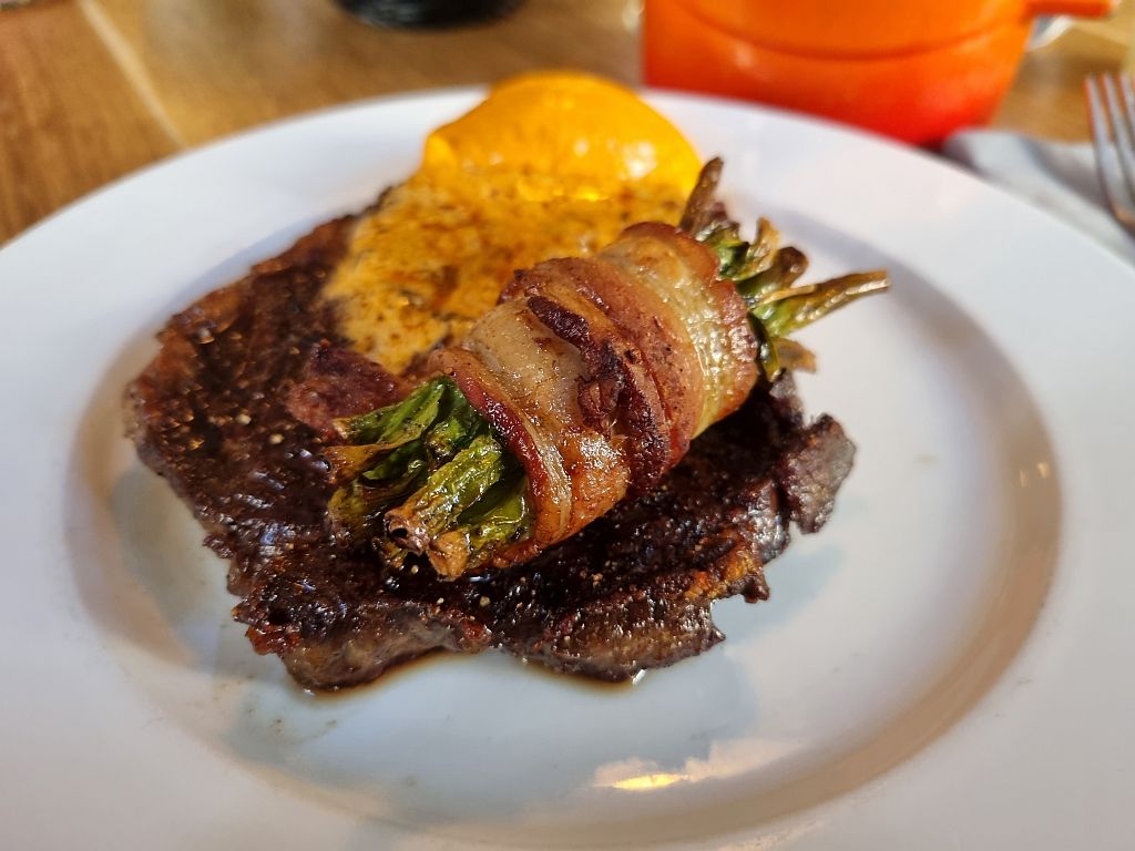 … und ein enttäuschen durchgebratenes Steak mit Bohnen und Creme de Paris für Jens.
