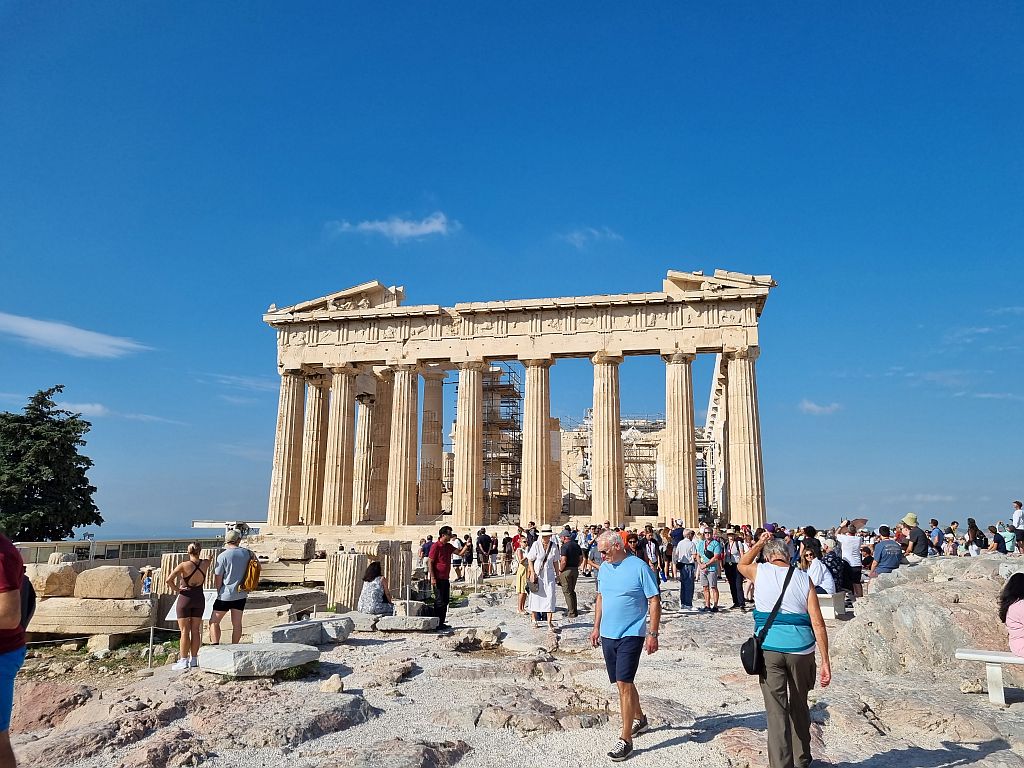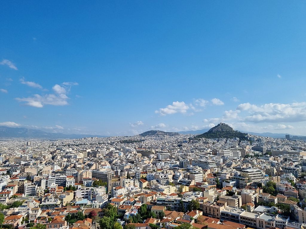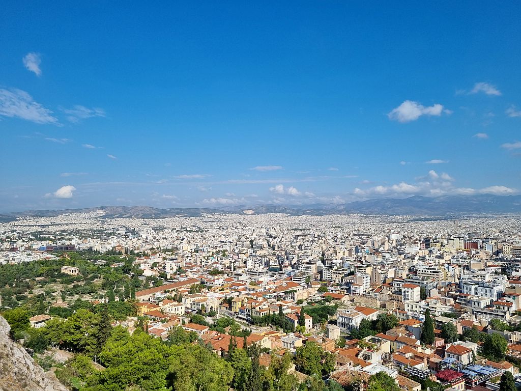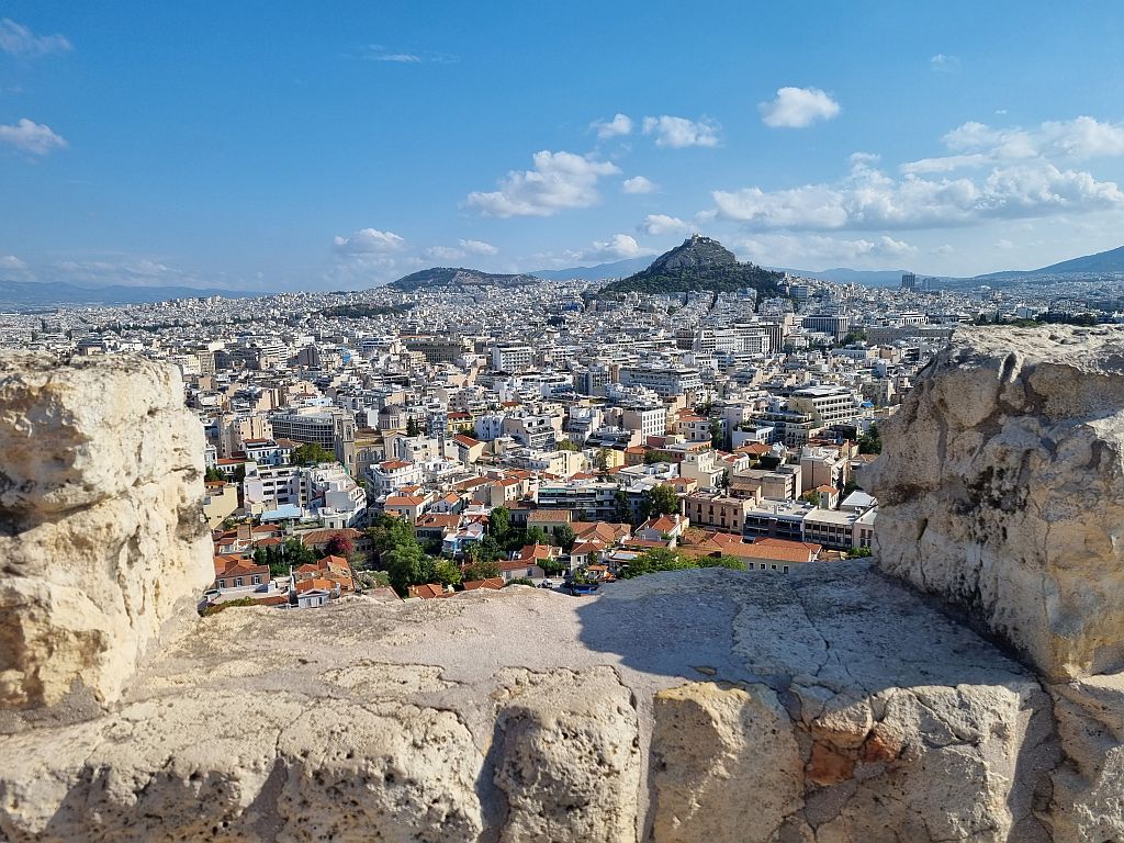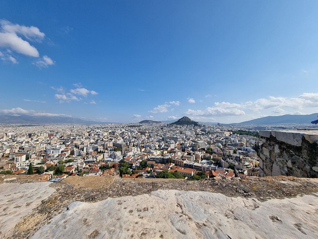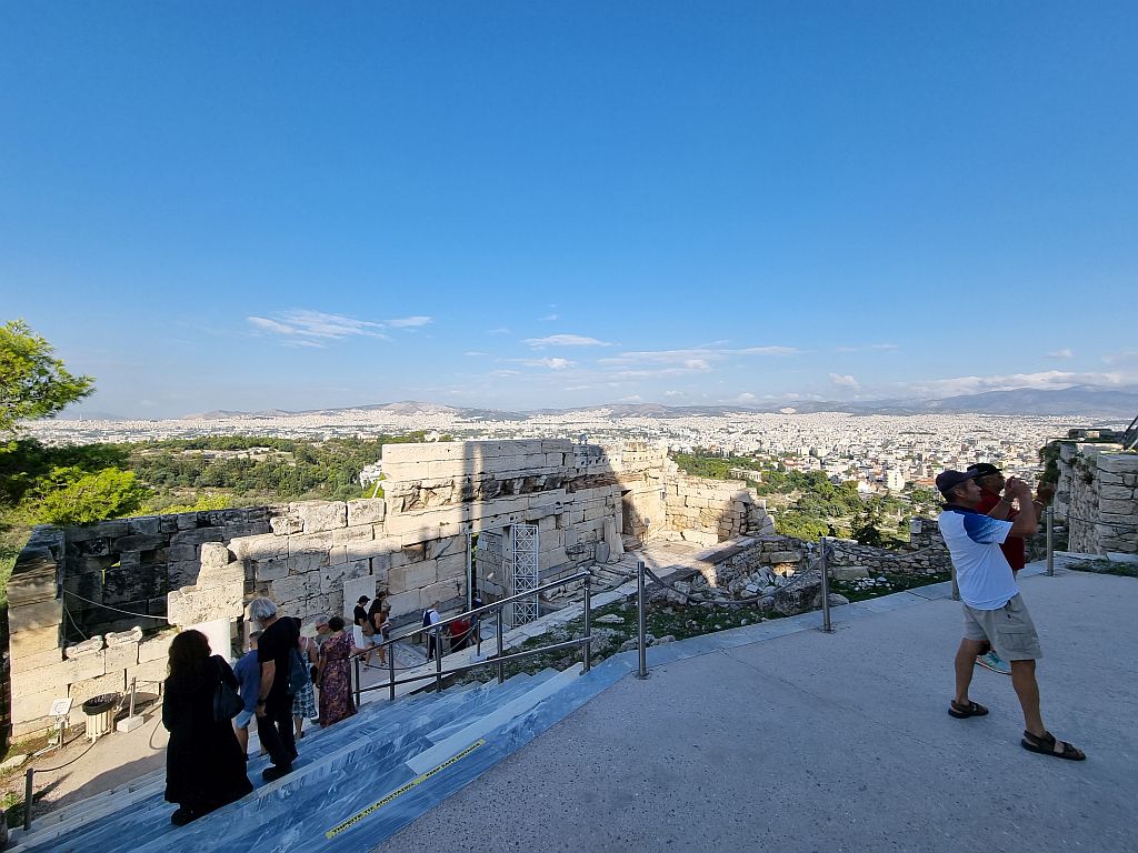 Vorteil war, dass man von hier aus einen wunderbaren Blick über die Gegend hatte. Das Wetter meinte es auch ganz gut mit uns, obwohl es noch knappe 31 Grad hatte. Aber es war nicht so schlimm wie im Sommer, wo der Zugang zur Akropolis zeitweise wegen der Hitze von über 40 Grad geschlossen wurde. Schatten gibt es hier nämlich fast keinen.