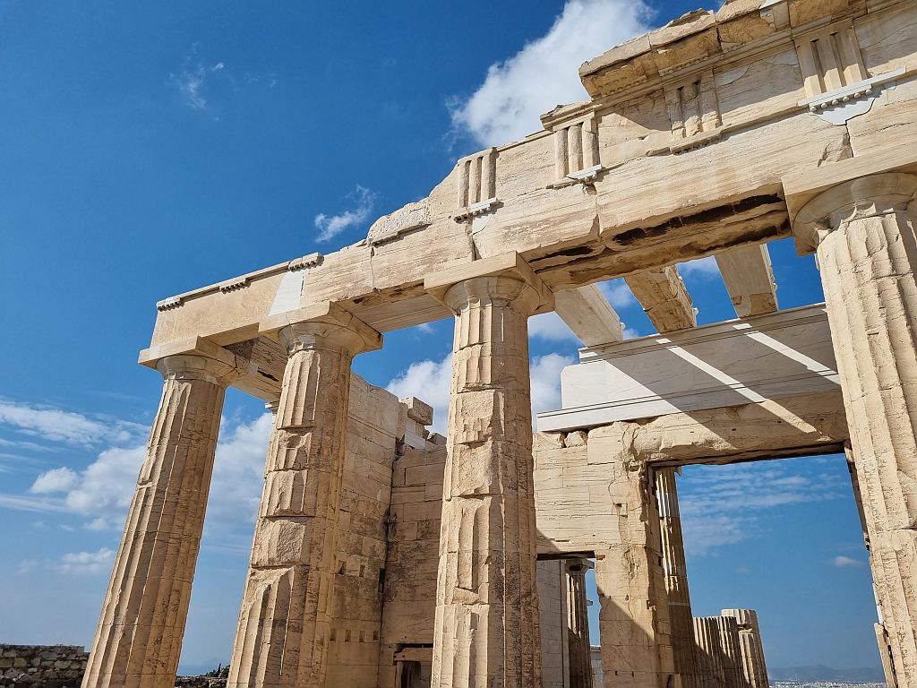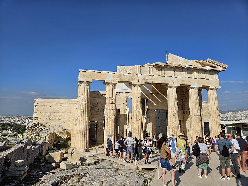 Eingang zum ehemaligen heiligen Bezirk sind die Propyläen, zwischen 437 und 432 vor Christus erbaut. Diese bestehen aus einem Torhaus und zwei Flügeln, die mit sechs dorischen (Danke Frau Döhl, ihr Jens) Säulen auf einer Plattform stehen. Das Dach war eher für Tempel gedacht, was wohl als Zeichen für die auf dem Festungsberg vorzufindenen Gebäuden galt.