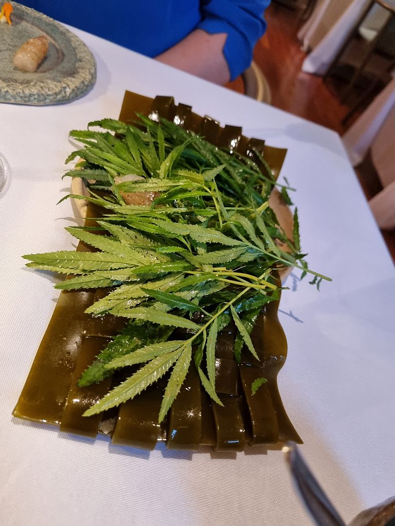 Der erste Gang war dann gleich mal sehr stylish angerichtet auf Algenblättern.