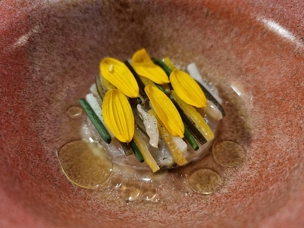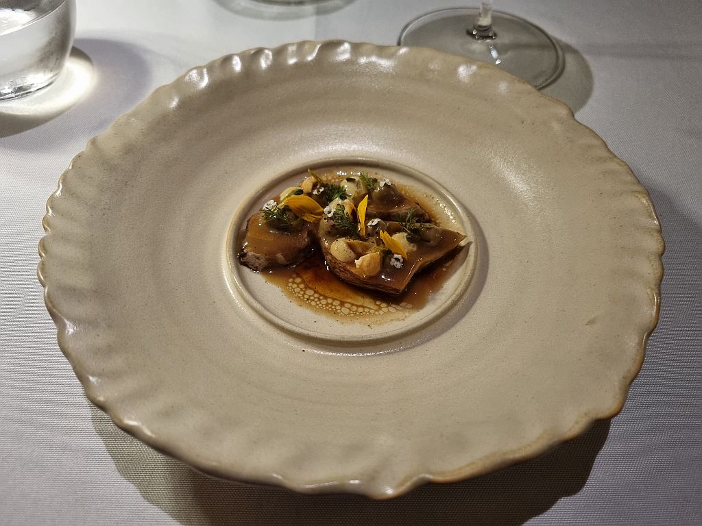 Dann ein handwerklich schöner Gang mit Bernsteinmakrele, gepickelter Limone, klein geschnittenen Muscheln und Kohlrabi. Das war auch geschmacklich sehr gut, denn die eher feste Makrele passte sehr gut zur Limone und dem Öl.
