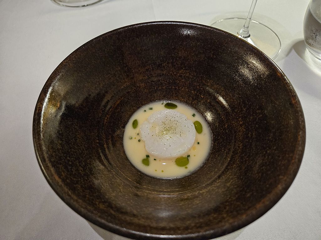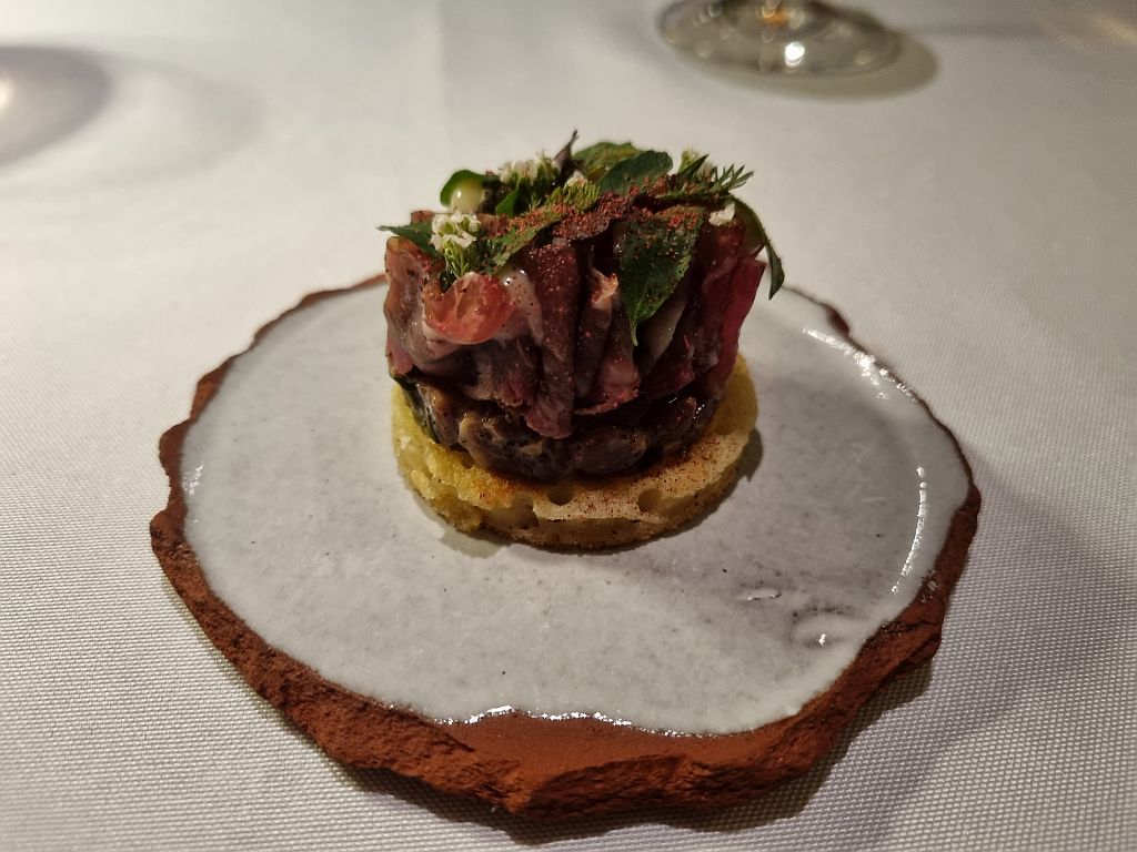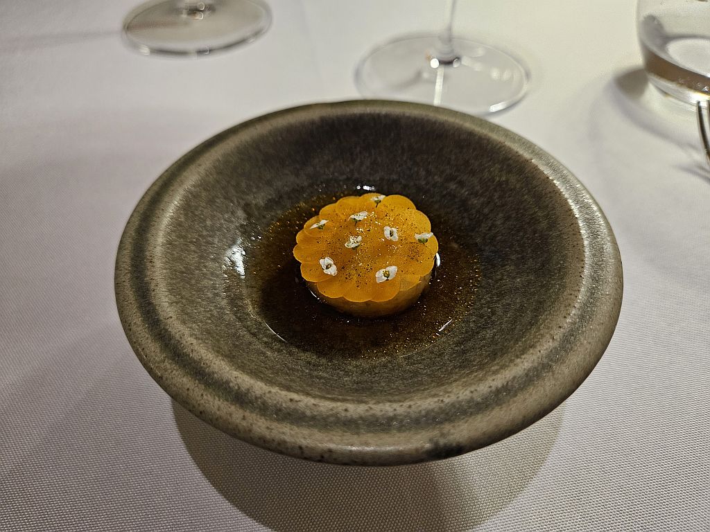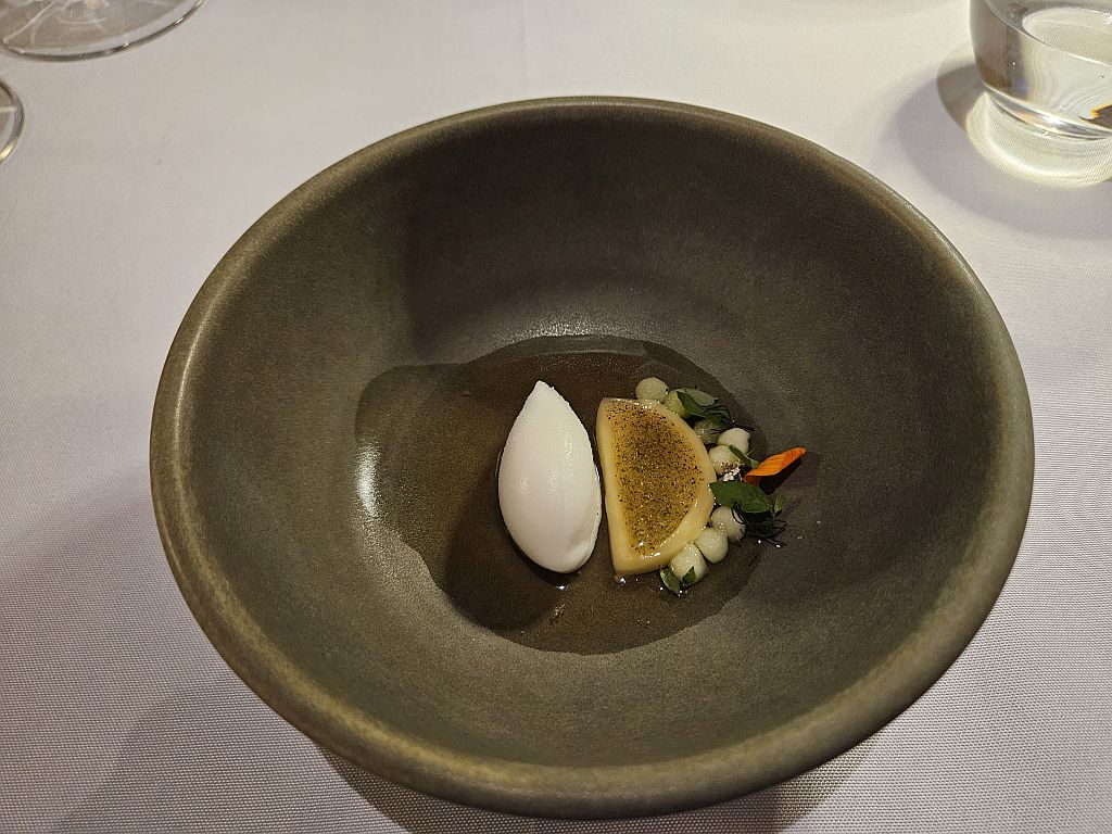 Sehr fein angerichtet, sehr klare Aromen mit Fokus auf dem Tintenfisch. Wie bei jedem Teller vorher auch schon gab es ein Hauptprodukt auf dem Teller und ergänzende Komponenten – nicht gerade der französische Ansatz, aber halt auch eher unser Geschmack, insofern schmeckte es uns sehr gut bisher.
