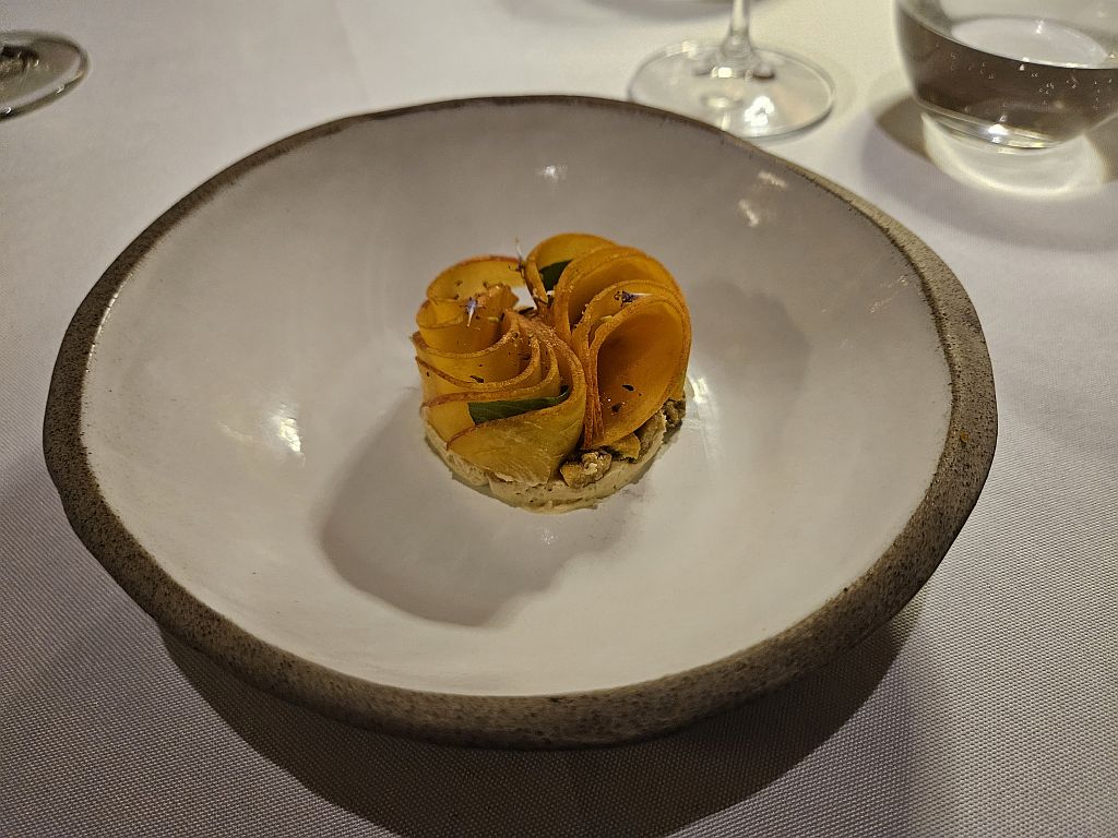 Wunderbarer Anfang, wobei zwischendurch uns das Tempo im Service schon fast zu hoch war. Aber ging gerade noch so ohne sich wirklich gedrängelt gefühlt zu haben. Etwas schwierig war es, dass nicht angesagt wurde, für wie viele Gänge das Glas Wein jetzt gedacht war und so hatten wir hier und da etwas wenig Wein und andererseits noch ein halb-volles Glas als das nächste an den Tisch gebracht wurde. Hier wäre etwas Info schön gewesen. Das sind aber auch schon die beiden einzigen Kritikpunkte am Service, wenn man das überhaupt als Kritik sehen möchte. Der Rest war nämlich hervorragend, freundlich und sehr aufmerksam.